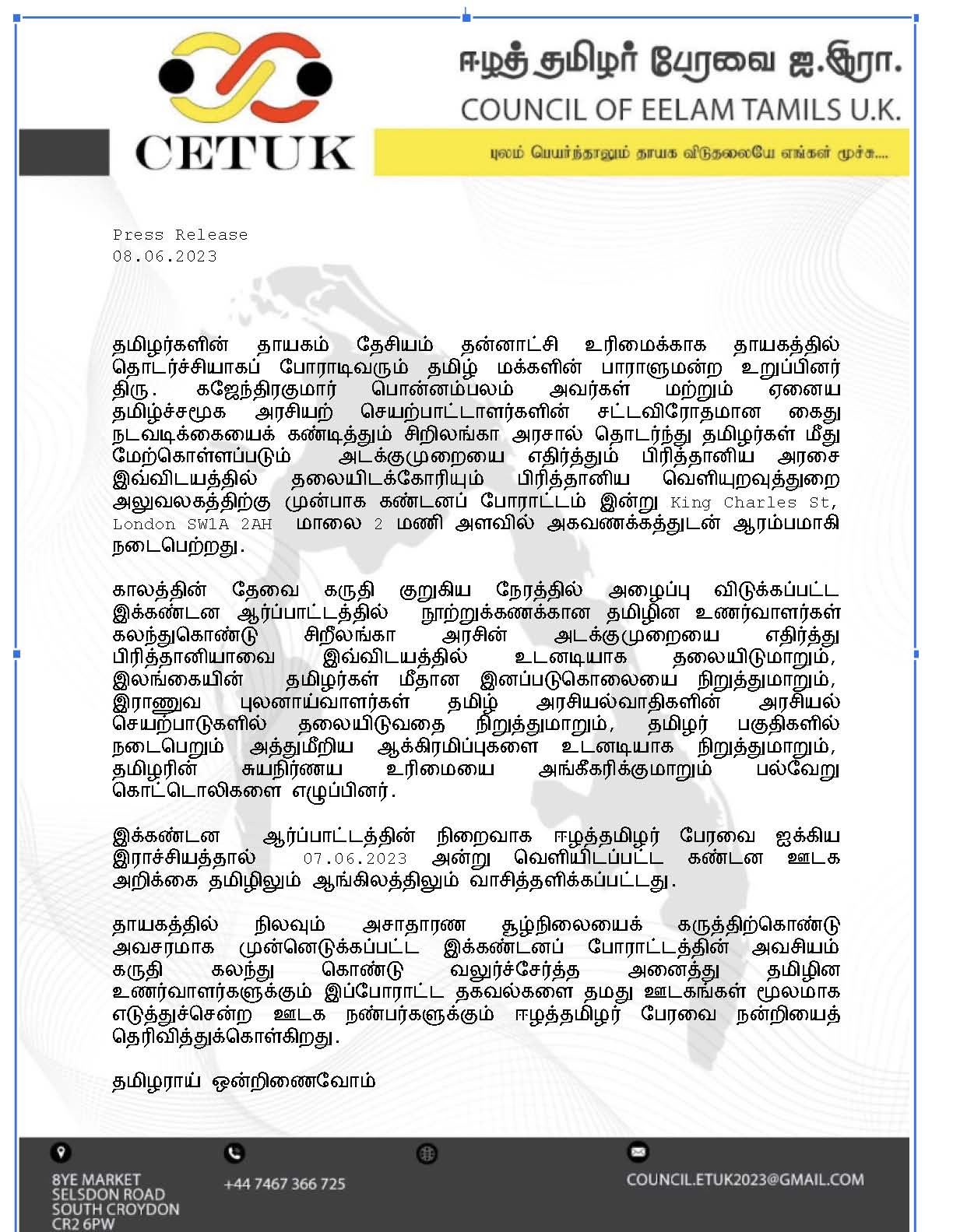இக்கண்டன ஆர்ப்பாட்டத்தின் நிறைவாக ஈழத்தமிழர் பேரவை ஐக்கிய இராச்சியத்தால் 07.06.2023 அன்று வெளியிடப்பட்ட கண்டன ஊடக அறிக்கை தமிழிலும் ஆங்கிலத்திலும் வாசித்தளிக்கப்பட்டது.
