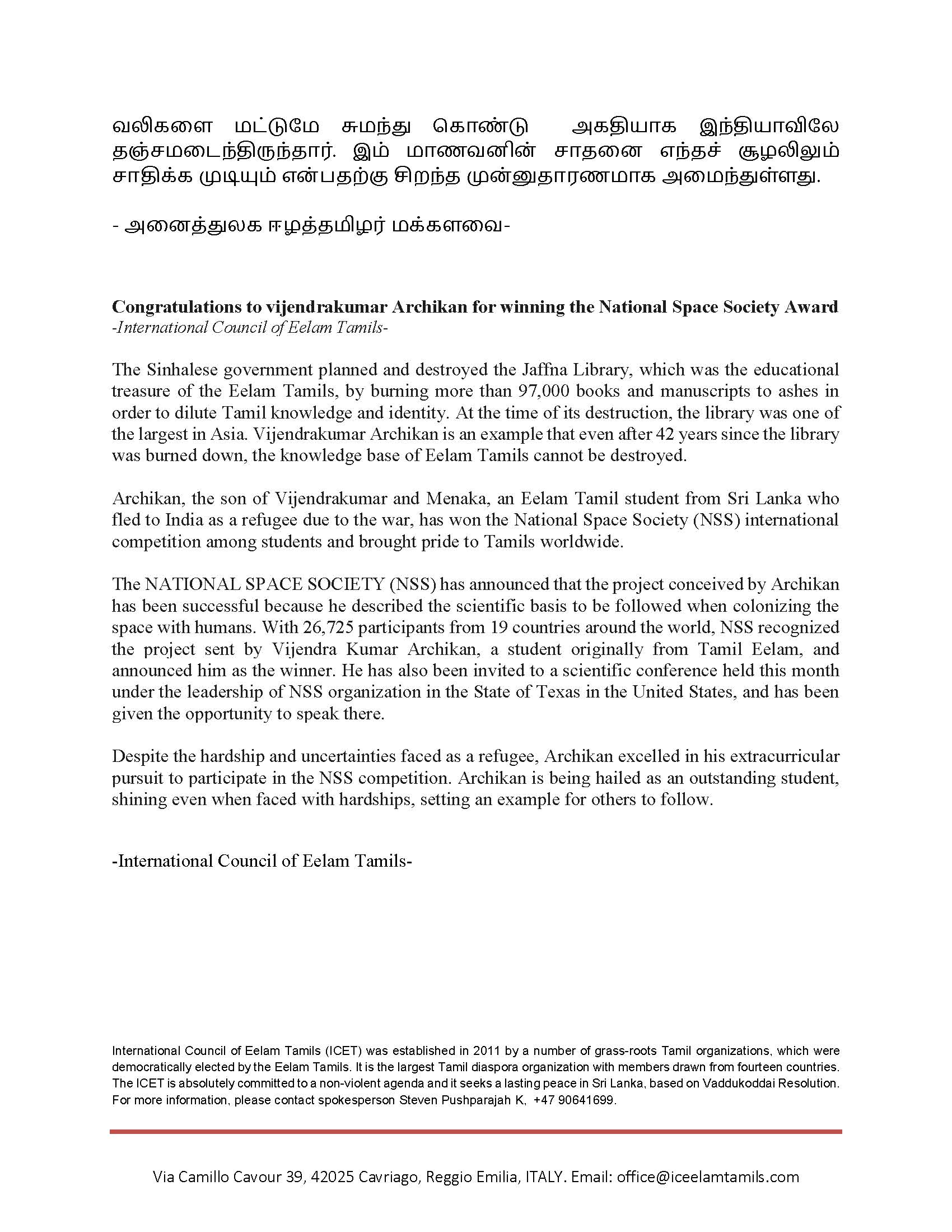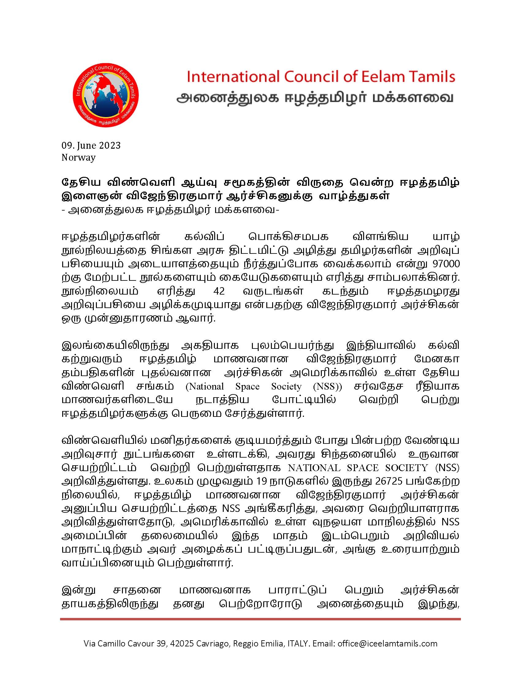 இலங்கையிலிருந்து அகதியாக புலம்பெயர்ந்து இந்தியாவில் கல்வி கற்றுவரும் ஈழத்தமிழ் மாணவனான விஜேந்திரகுமார் மேனகா தம்பதிகளின் புதல்வனான அர்ச்சிகன் அமெரிக்காவில் உள்ள தேசிய விண்வெளி சங்கம் (National Space Society (NSS)) சர்வதேச ரீதியாக மாணவர்களிடையே நடாத்திய போட்டியில் வெற்றி பெற்று ஈழத்தமிழர்களுக்கு பெருமை சேர்த்துள்ளார்.