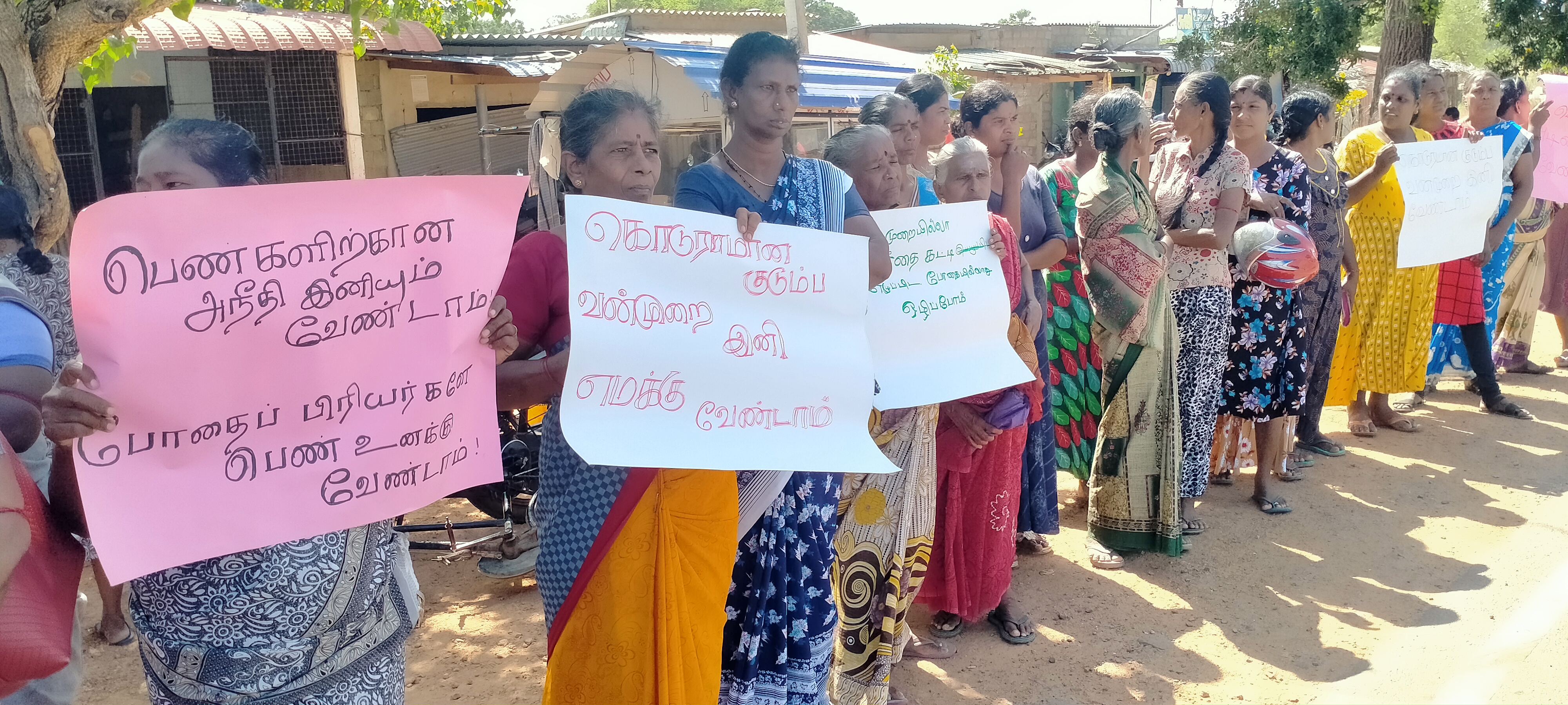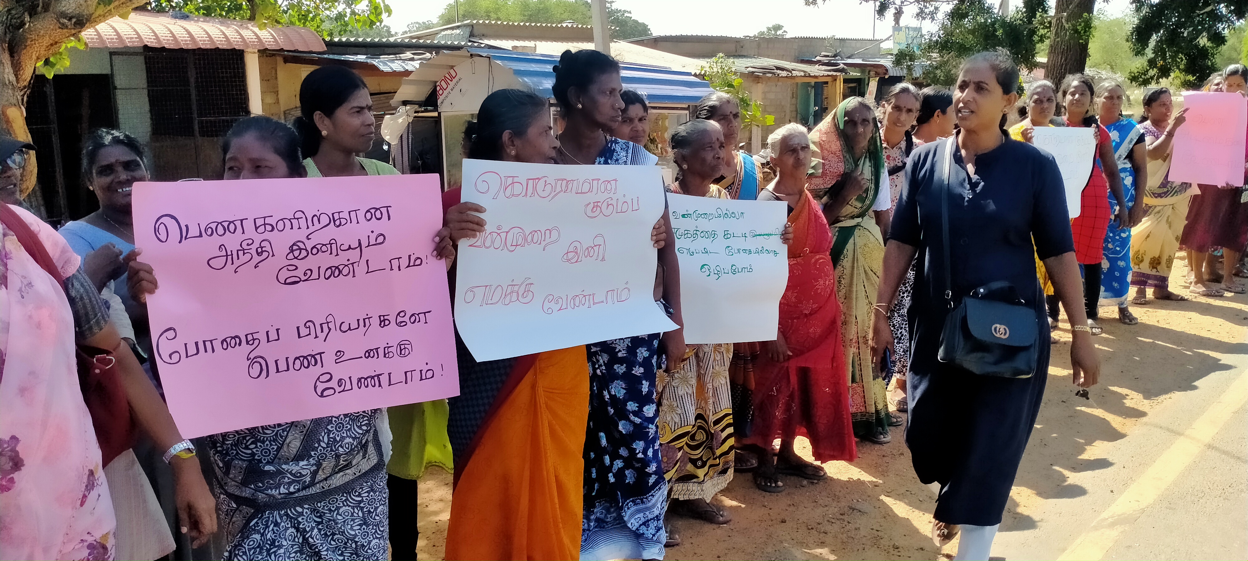 இப்பேரணியில் ‘பெண்களுக்கான அநீதி வேண்டாம்’, ‘போதை பிரியர்களே பெண் உனக்கு வேண்டாம்’, ‘கொடூரமான குடும்ப வன்முறை இனி எமக்கு வேண்டாம்’ போன்ற சுலோகங்களை தாங்கியிருந்தனர்.