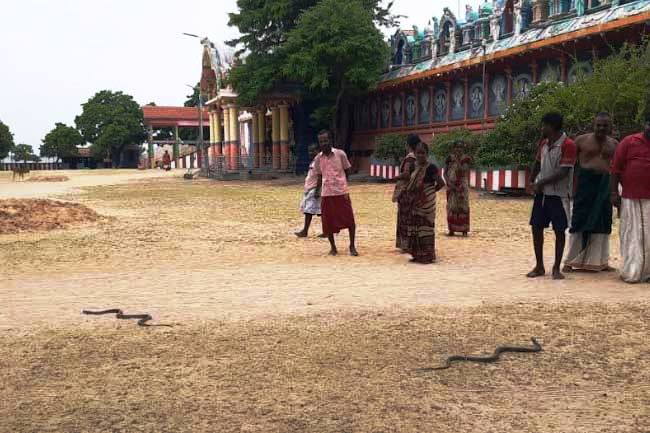 நாக பாம்புகள் வலம் வந்து படம் எடுக்கும் காட்சி சமூக ஊடகங்களில் பகிரப்பட்டு வருகிறது.