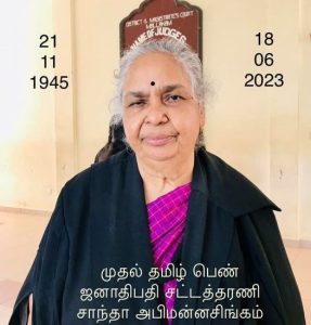 முதல் பெண் ஜனாதிபதி சட்டத்தரணி சாந்தா அபிமன்னசிங்கம் (வயது 78) நேற்றைய தினம் ஞாயிற்றுக்கிழமை இரவு காலமானார்.
