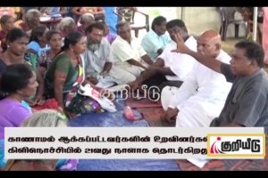 காணாமல் போனவர்களை மீட்டுத்தரக்கோரி காணாமல் போனவர்களின் உறவினர்களால் கிளிநொச்சியில் மேற்கொள்ளப்படும் கவனயீர்ப்புப்போராட்டம், 21வது நாளாக இன்றும் தொடர்கிறது.