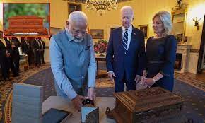 பின்னர் வெள்ளை மாளிகை சென்றார். அப்போது அமெரிக்க ஜனாதிபதி ஜோ பைடன்- அவரது மனைவி ஜில் பைடன் ஆகியோர் பிரதமர் மோடி வரவேற்றனர். இரு தலைவர்களும் கட்டித்தழுவி அன்பை பரிமாறிக் கொண்டனர். அதன்பின் இருநாட்டு தலைவர்களும் பரிசுகளை பரிமாறிக் கொண்டனர். பிரதமர் மோடி சந்தன கட்டையால் செய்யப்பட்ட கலைவண்ணம் மிக்க பெட்டியை ஜோ பைடனுக்கு பரிசாக வழங்கினார்.