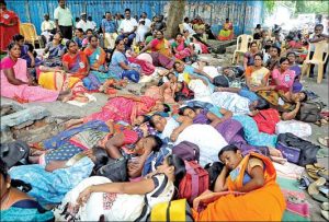 இந்நிலையில், 2-வது நாளாகநேற்றும் போராட்டம் தொடர்ந்தது.அப்போது சங்கத் தலைவர் கலா உட்பட15-க்கும் மேற்பட்டபெண்கள் உடல் சோர்வால் மயக்கமடைந்தனர். இதையடுத்து, அவர்களுக்கு முதலுதவி அளிக்கப்பட்டு, ஆம்புலன்ஸில் ஓமந்தூரார் அரசு மருத்துவமனைக்கு அழைத்துச் செல்லப்பட்டனர்.