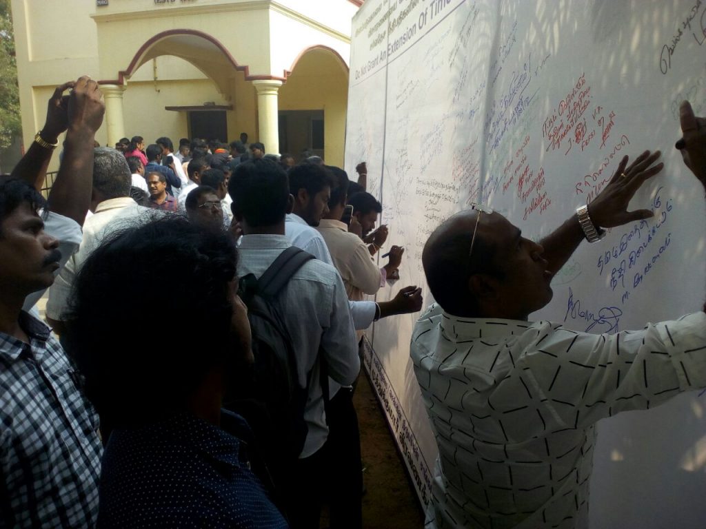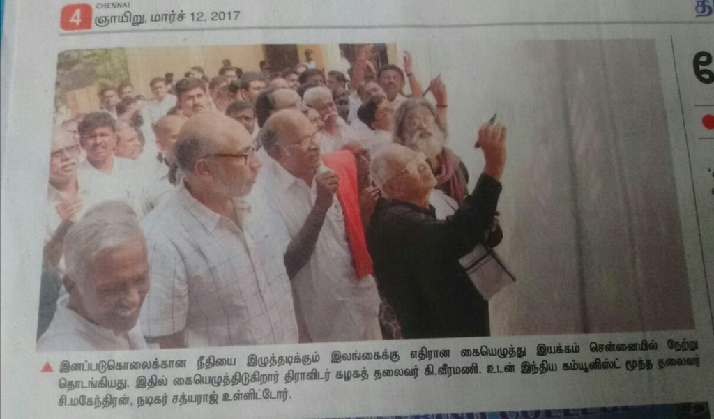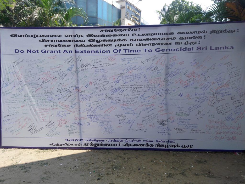 தமிழர்களை இனப்படுகொலை செய்த சிறிலங்கா அரசாங்கத்திற்கு மேலும் கால அவகாசத்தினை வழங்கும் வகையில் நடப்பு ஐ.நா.மனித உரிமைகள் பேரவை கூட்டத்தொடரில் தீர்மானம் கொண்டுவரப்பட்டுள்ளது.இதனை கண்டித்தும் சர்வதேச விசாரணையை வலியுறுத்தியும் ‘வீரத் தமிழ் மகன்’ முத்துக்குமார் நினைவேந்தல் குழுவினால் கையெழுத்துப் போராட்டம் நடத்தப்பட்டுள்ளது.சென்னை பத்திரிகையாளர் மன்றத்தில் ஏற்பாடு செய்யப்பட்டிருந்த கையெழுத்துப் போராட்டம் கடந்த சனிக்கிழமை காலை 9 மணியளவில் நடந்துள்ளது.