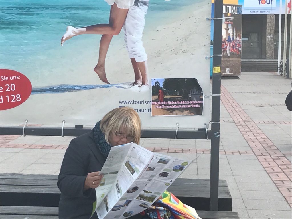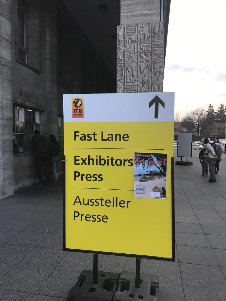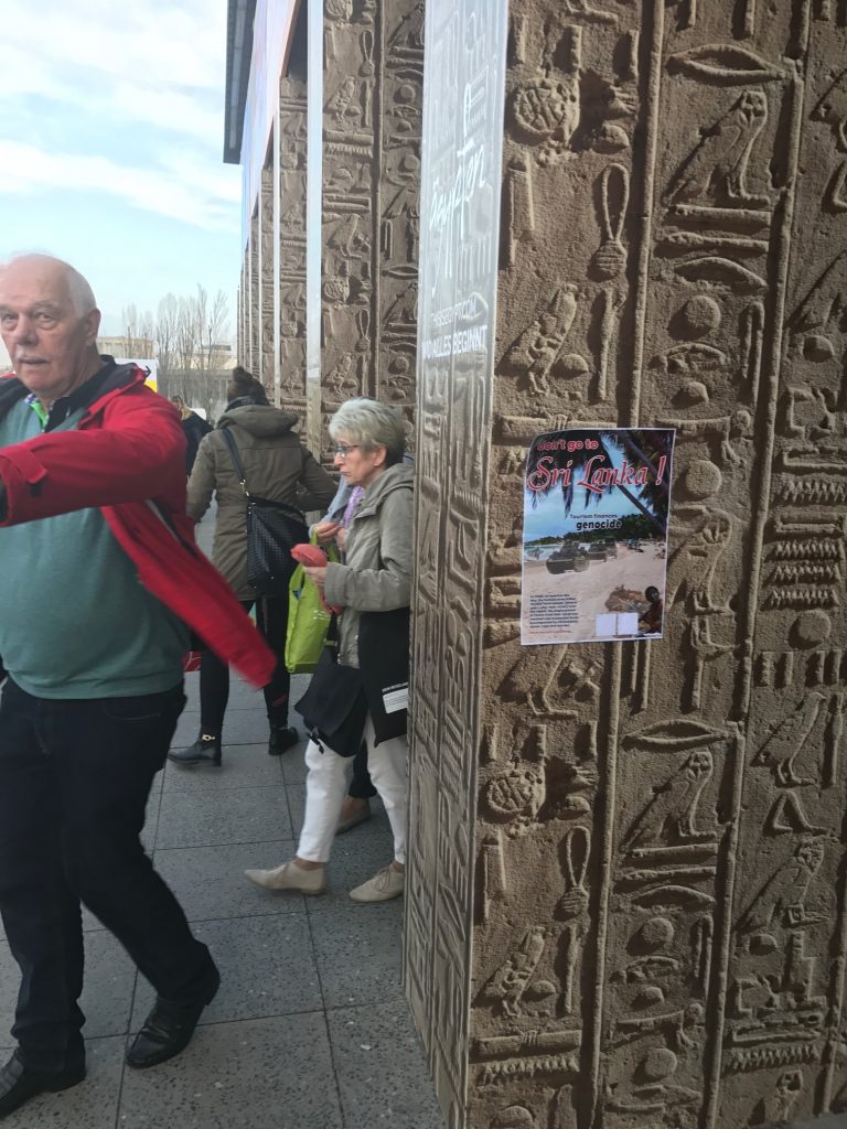 யேர்மனி தலைநகர் பேர்லினில் உலகளாவிய ரீதியில் மாபெரும் சுற்றுலாத்துறை கண்காட்சி கடந்த நாட்களாக நடைபெற்றது.இவ் நிகழ்வில் வழமை போல் சிறீலங்காவும் பங்குபற்றி தமிழின அழிப்பை மூடிமறைக்கும் முகமாக சுற்றுலாத்துறை ஊடாக தனது பொய்ப் பிரச்சாரத்தை மேற்கொண்டது .சிறீலங்கா அரசின் பொய்முகத்தை அம்பலப்படுத்தும் முகமாக கண்காட்சி நடைபெறும் மண்டபத்துக்கு வெளித்திடலில் தமிழின அழிப்பை எடுத்துரைக்கும் சுவரொட்டிகள் ஒட்டப்பட்டன. சுவரொட்டிகளில் சுற்றுலாத்துறை தமிழ் மக்களின் இன அழிப்புக்கு நிதி வழங்குகின்றது என்பதை வெளிப்படுத்தும் முகமாக வடிவமைக்கப்பட்டிருந்தது.