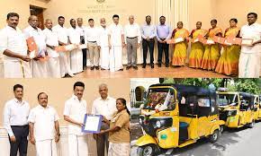 நிகழ்ச்சியில், அமைச்சர் பி.கே. சேகர்பாபு, தலைமைச் செயலாளர் சிவ்தாஸ் மீனா ஆகியோர் கலந்து கொண்டனர். முதலமைச்சர் மு.க.ஸ்டாலின் இன்று தலைமைச் செயலகத்தில், தொழிலாளர் நலன் மற்றும் திறன் மேம்பாட்டுத்துறையின் கீழ் செயல்படும் தமிழ்நாடு அமைப்புசாரா ஓட்டுநர்கள் மற்றும் தானியங்கி மோட்டார் வாகனங்கள் பழுது பார்க்கும் தொழிலாளர்கள் நல வாரியத்தின் சார்பில் பதிவு பெற்ற 500 பெண் ஓட்டுநர்களுக்கு புதிய ஆட்டோ ரிக்சா வாங்குவதற்காக தலா ரூ.1 லட்சம் மானியம் வழங்கும் திட்டத்தை தொடங்கி வைத்து, 10 பயனாளிகளுக்கு இத்திட்டத்தின் கீழ் வாங்கப்பட்ட புதிய ஆட்டோ ரிக்சாக்களுக்கான பதிவு சான்று மற்றும் அனுமதி ஆவணங்களை வழங்கினார். நிகழ்ச்சியில், அமைச்சர் சி.வெ.கணேசன், தலைமைச் செயலாளர் சிவ்தாஸ் மீனா, தொழிலாளர் நலன் மற்றும் திறன் மேம்பாட்டுத் துறை கூடுதல் தலைமைச் செய லாளர் முகமது நசிமுத்தின் ஆகியோர் கலந்து கொண்டனர்.