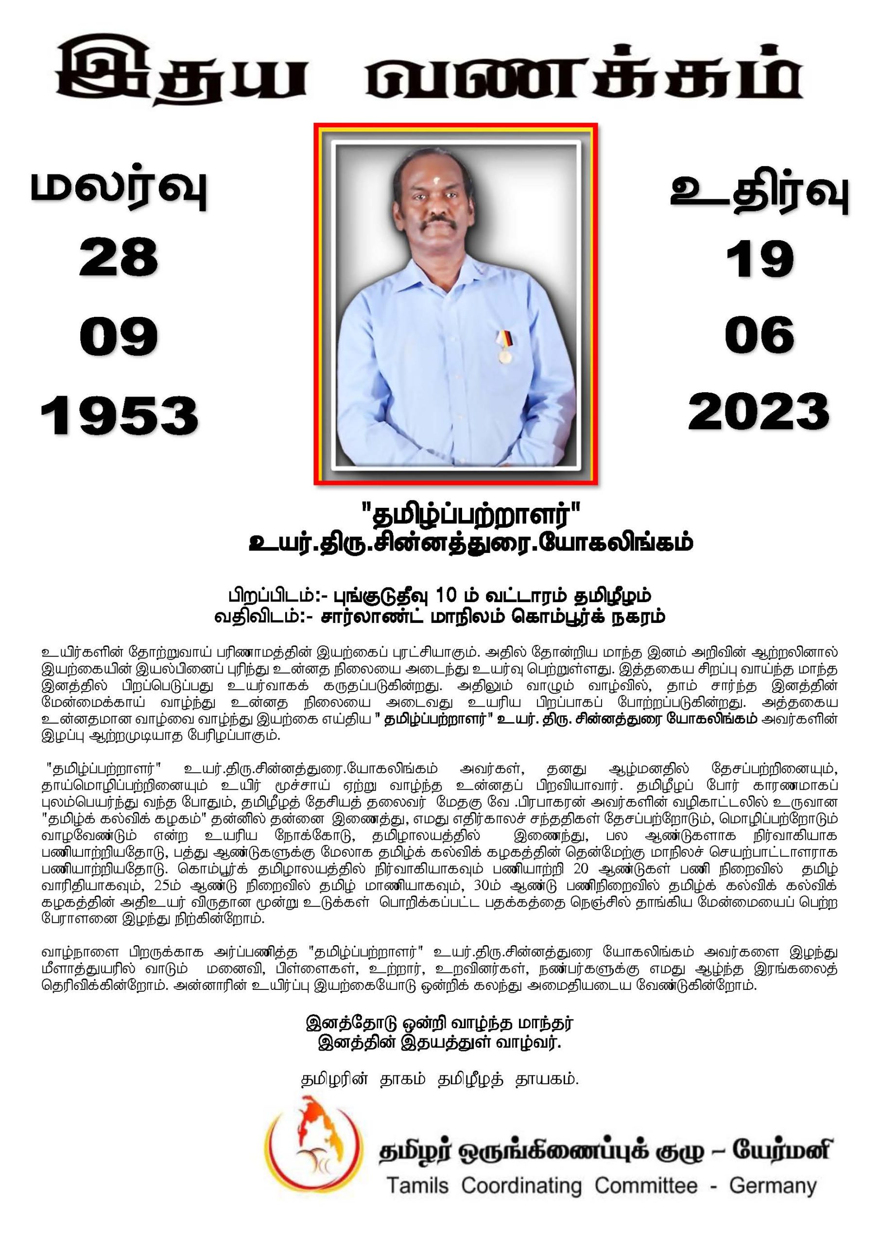 வாழ்நாளை பிறருக்காக அர்ப்பணித்த ‘தமிழ்ப்பற்றாளர்’ உயர்.திரு.சின்னத்துரை யோகலிங்கம் அவர்களை இழந்து மீளாத்துயரில் வாடும் மனைவி, பிள்ளைகள், உற்றார், உறவினர்கள், நண்பர்களுக்கு எமது ஆழ்ந்த இரங்கலைத் தெரிவிக்கின்றோம். அன்னாரின் உயிர்ப்பு இயற்கையோடு ஒன்றிக் கலந்து அமைதியடைய வேண்டுகின்றோம்.