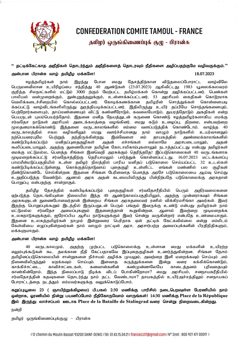 கறுப்புயூலை 23 ( ஞாயிற்றுக்கிழமை) பி.பகல் 2:30 மணிக்கு பாரிசில் நடைபெறவுள்ள பேரணியில் நாம் ஒன்றாக, ஓரணியில் நின்று பயணிப்போம்; நீதிகோருவோம் வாருங்கள்! 14:30 மணிக்கு Place de la République இல் இருந்து லாச்சப்பல் ஊடாக ; Clhf Place de la Bataille de Stalingrad tiu வரை சென்று நிறைவடைகின்றது.