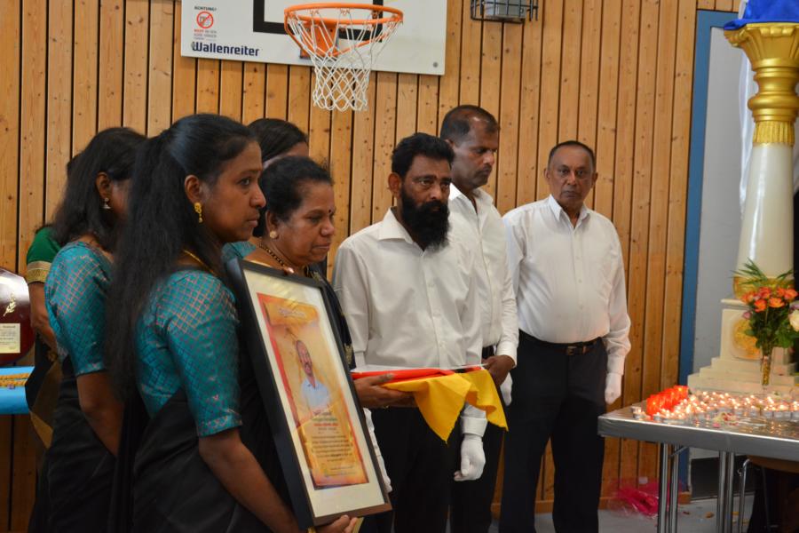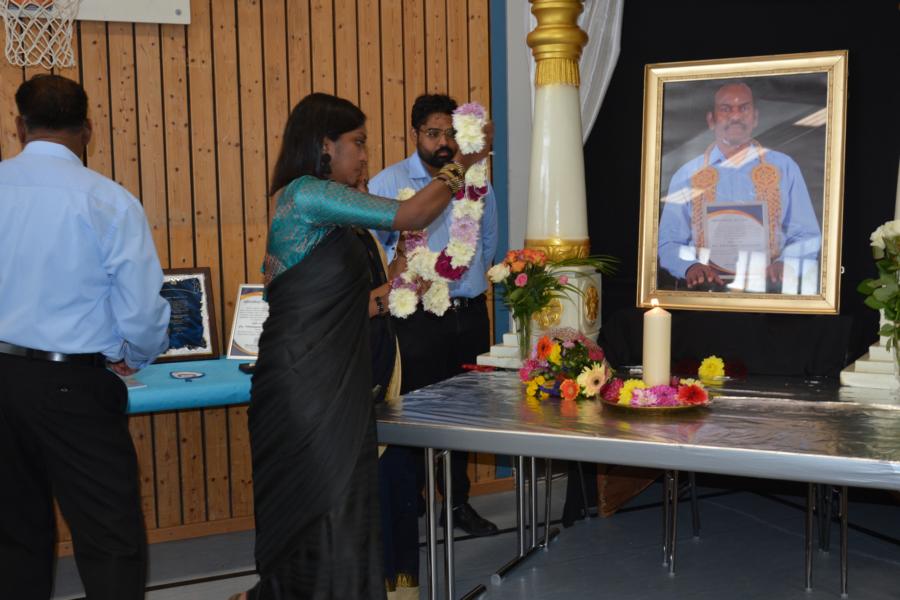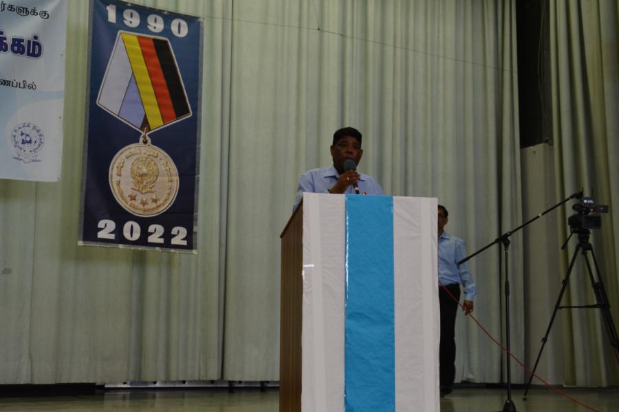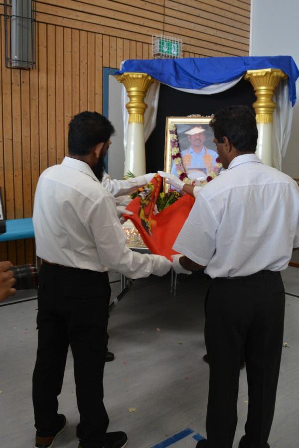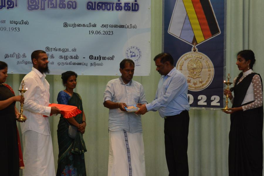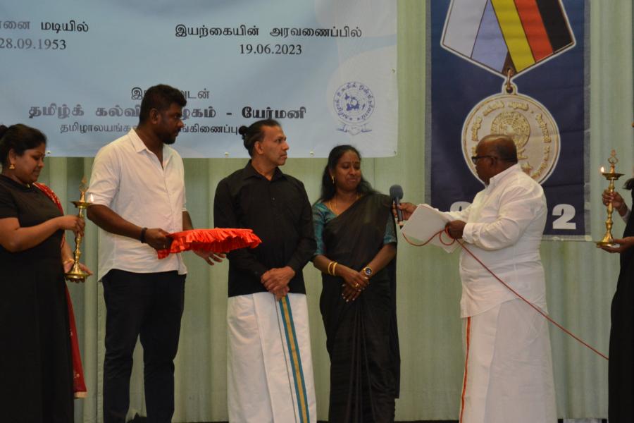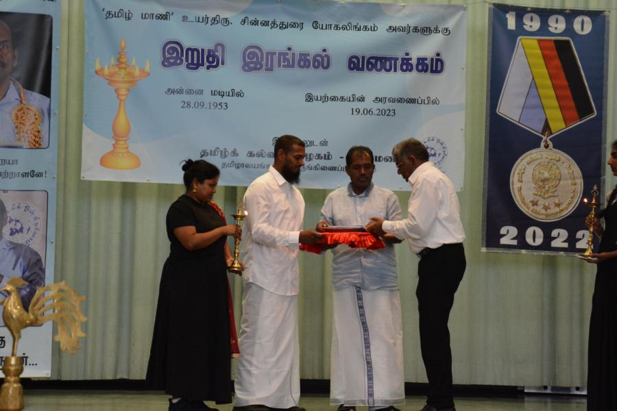 தொடர்ந்து அரங்கைக் கையேற்ற மாவீரர் பணிமனையால், அதனது மரபுகளுக்கமைவாகத் தேசியக்கொடி எடுத்துவரப்பட்டு மதிப்பளிப்புச் செய்யப்பட்டதோடு, அனைத்துல தொடர்பகத்தால் வழங்கப்பட்ட சிறப்புப் பட்டமான “தமிழ்ப்பற்றாளர்” என்ற பட்டமும் வழங்கப்பட்டதோடு அதற்கான சான்றிதழும், தேசியக்கொடியும் அவரது துணைவியாரிடம், பிள்ளைகளிடமும் கையளிக்கப்பட்டது.