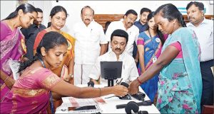 தொடர்ந்து, விண்ணப்பங்களை பயோமெட்ரிக் முறையில் பதிவு செய்யும் பணிகளை பார்வையிட்டு ஆய்வு செய்தார். விண்ணப்ப பதிவுக்காக வந்திருந்த பெண்களுடன் கலந்துரையாடினார்.
