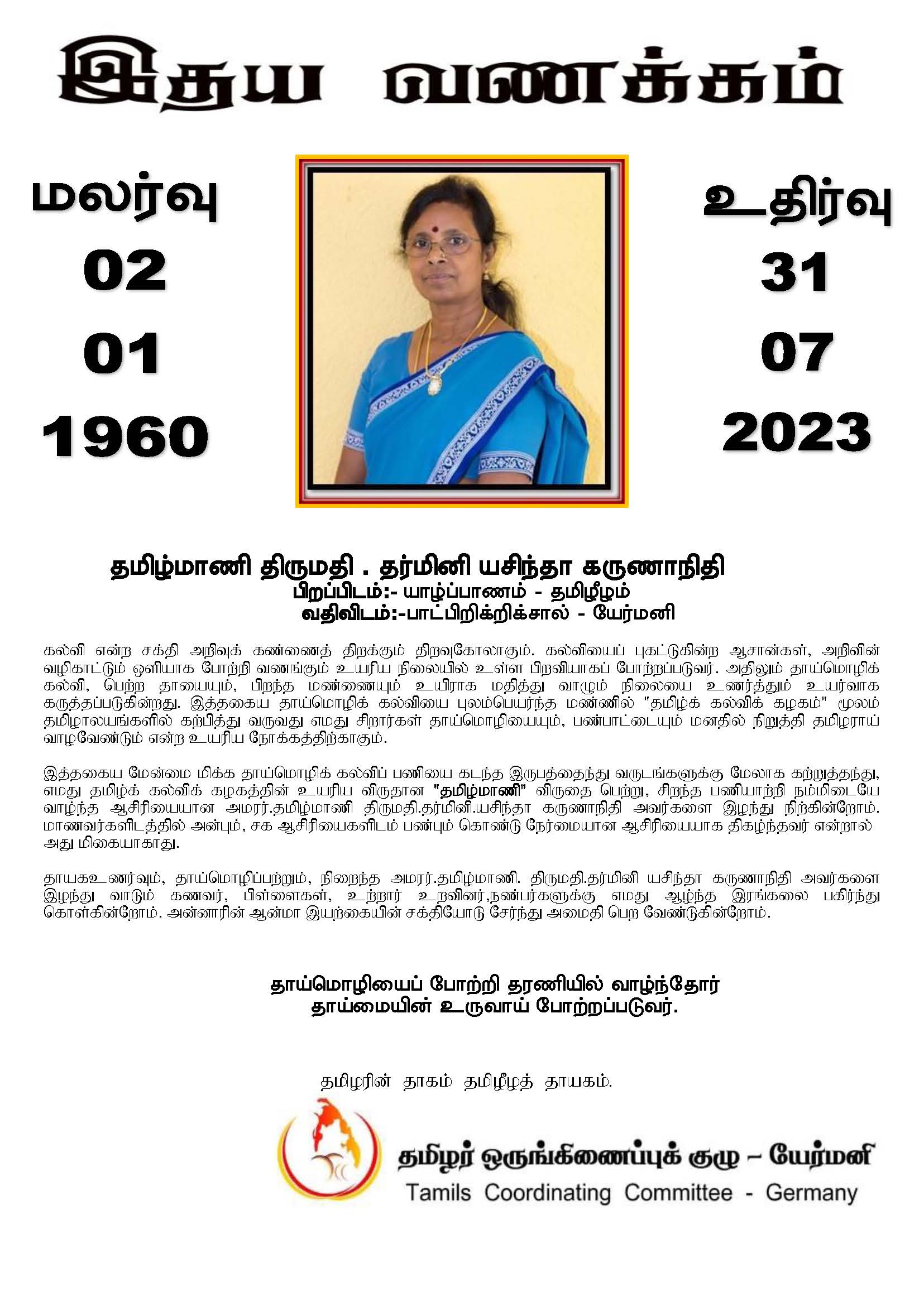 தாயகஉணர்வும், தாய்மொழிப்பற்றும், நிறைந்த அமரர்.தமிழ்மாணி. திருமதி.தர்மினி யசிந்தா கருணாநிதி அவர்களை இழந்து வாடும் கணவர், பிள்ளைகள், உற்றார் உறவினர்,நண்பர்களுக்கு எமது ஆழ்ந்த இரங்கலை பகிர்ந்து கொள்கின்றோம். அன்னாரின் ஆன்மா இயற்கையின் சக்தியோடு சேர்ந்து அமைதி பெற வேண்டுகின்றோம்.
