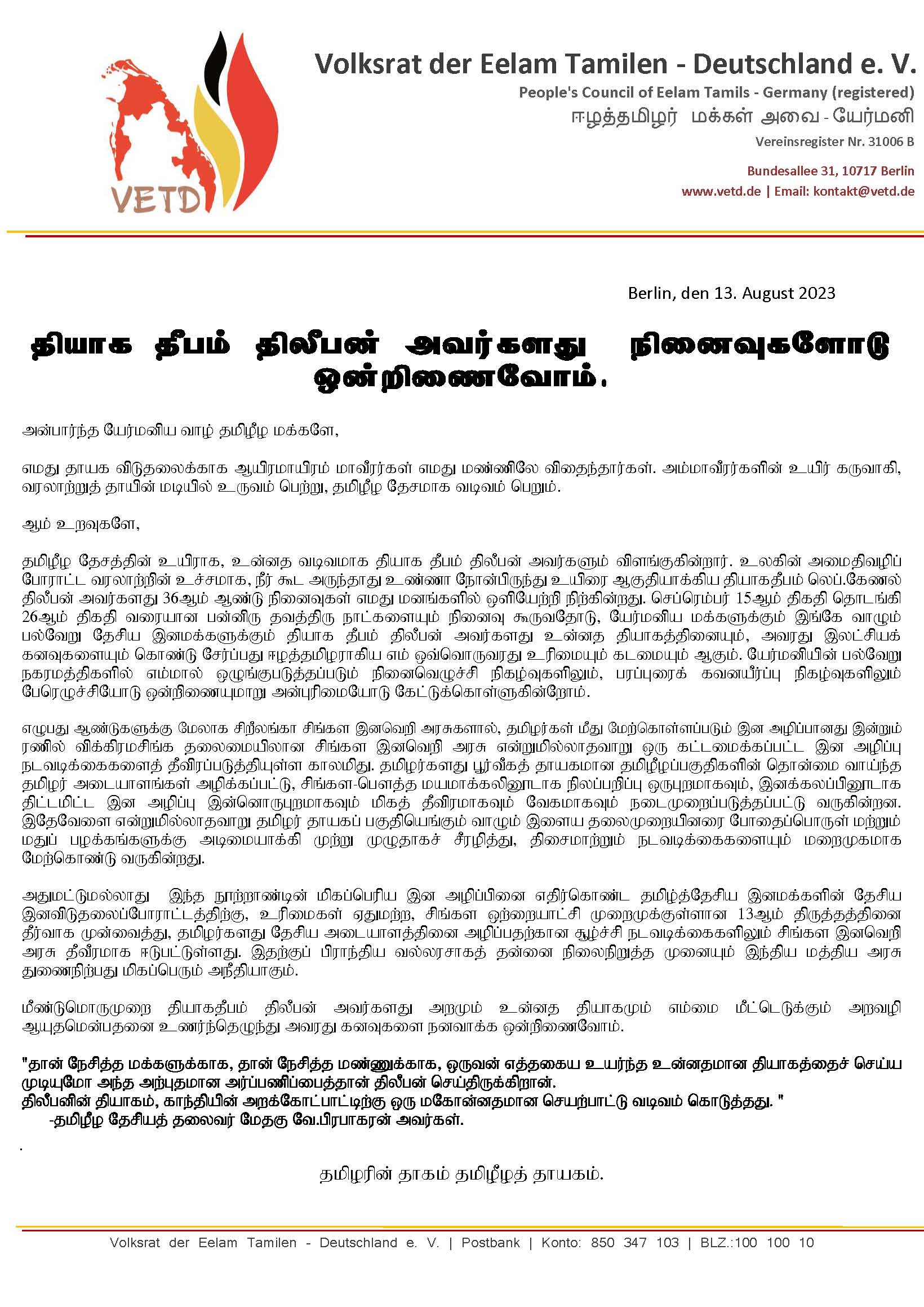 தமிழீழ தேசத்தின் உயிராக, உன்னத வடிவமாக தியாக தீபம் திலீபன் அவர்களும் விளங்குகின்றார். உலகின் அமைதிவழிப் போராட்ட வரலாற்றின் உச்சமாக, நீர் கூட அருந்தாது உண்ணா நோன்பிருந்து உயிரை ஆகுதியாக்கிய தியாகதீபம் லெப்.கேணல் திலீபன் அவர்களது 36ஆம் ஆண்டு நினைவுகள் எமது மனங்களில் ஒளியேற்றி நிற்கின்றது. செப்ரெம்பர் 15ஆம் திகதி தொடங்கி 26ஆம் திகதி வரையான பன்னிரு தவத்திரு நாட்களையும் நினைவு கூருவதோடு, யேர்மனிய மக்களுக்கும் இங்கே வாழும் பல்வேறு தேசிய இனமக்களுக்கும் தியாக தீபம் திலீபன் அவர்களது உன்னத தியாகத்தினையும், அவரது இலட்சியக் கனவுகளையும் கொண்டு சேர்ப்பது ஈழத்தமிழராகிய எம் ஒவ்வொருவரது உரிமையும் கடமையும் ஆகும். யேர்மனியின் பல்வேறு நகரமத்திகளில் எம்மால் ஒழுங்குபடுத்தப்படும் நினைவெழுச்சி நிகழ்வுகளிலும், பரப்புரைக் கவனயீர்ப்பு நிகழ்வுகளிலும் பேரெழுச்சியோடு ஒன்றிணையுமாறு அன்புரிமையோடு கேட்டுக்கொள்ளுகின்றோம்.