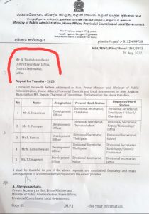 யாழ்ப்பாண மாவட்டத்திலுள்ள பிரதேச செயலகங்களில் கடமையாற்றும் ஐந்து பேரின் இடமாற்றங்களை நிறுத்துவதற்கு பொது நிர்வாக உள்நாட்டு அலுவலர்கள் அமைச்சின் பிரத்தியேக செயலாளரினால் யாழ்ப்பாண மாவட்ட அரசாங்க அதிபருக்கு எழுத்து மூலம் கடிதம் அனுப்பப்பட்டது.
