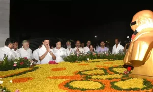 இந்நிலையில், திமுக தலைவராக 6வது ஆண்டில் அடுயெடுத்து வைத்ததை அடுத்து முதலமைச்சர் மு.க.ஸ்டாலின் இன்று முன்னாள் முதலமைச்சர் கருணாநிதியின் நினைவிடத்தில் மலர்தூவி மரியாதை செலுத்தினார்.