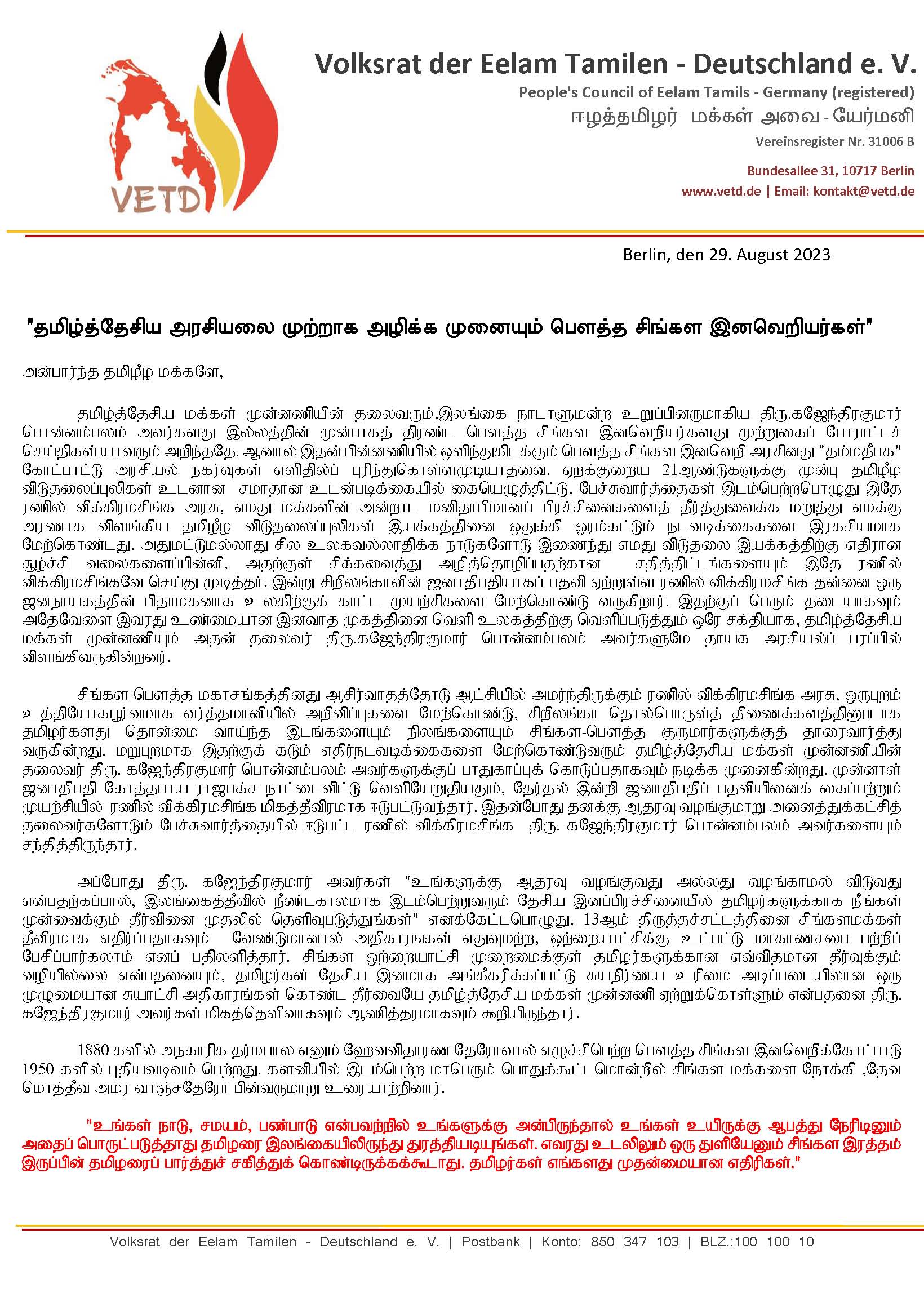 இதுபோன்ற தேரர்களின் ஆசிர்வாதத்தோடும் அவர்களது மகாசங்கத்தின் ஆணைகளை அரசியலாக்கும் சிங்கள இனவெறி அரசுகளின் 75 ஆண்டுகால இன அழிப்பு நடவடிக்கைகளில் மாற்றம் ஏதும் நிகழப்போவதில்லை. இன்று எமது உரிமைகளுக்காகக் குரல் கொடுத்துவரும் தமிழ்த்தேசிய சக்திகளை இல்லாதொழிக்கும் நடவடிக்கைகளில் சிங்கள இனவாத அரசும் அதற்கு முண்டுகொடுக்கும் பிராந்திய வல்லரசாக முனையும் நாடுகளும் தீவிரமாக ஈடுபடுகின்றன. ஒரு தேர்தல் மூலம் மக்களால் தெரிவுசெய்யப்பட்ட நாடாளுமன்ற உறுப்பினருக்கே பாதுகாப்பற்ற நிலையெனில் சாதாரணமான தமிழ்மக்களின் நிலை எவ்வாறென ஜனநாயகம் போதிக்கும் உலகநாடுகள் சிந்திக்கவேண்டும். இதனைத்தடுத்து நிறுத்தி அவர்களுக்கான பாதுகாப்பினை உறுதிப்படுத்த வேண்டியது தமிழ்மக்களாகிய எமது கடமையாகும். அரசியல்ரீதியாக திரு. கஜேந்திரகுமார் பொன்னம்பலம் அவர்களுக்கும் அவர் தலைமையிலான தமிழ்த்தேசிய மக்கள் முன்னணிக்கும் ஈழத்தமிழர்கள் முழுமையாக வழங்கக்கூடிய ஆதரவு மூலமாகவே அவர்களுடைய பாதுகாப்பையும் உறுதிப்படுத்த முடியும்.