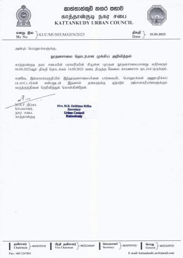 இந்நிலையில், தற்போது காத்தான்குடி நகர சபையின் பராமரிப்பில் உள்ள இந்த நூதனசாலையை சில தினங்களுக்கு மூடவுள்ளதாக அறிவிக்கப்பட்டுள்ளது.