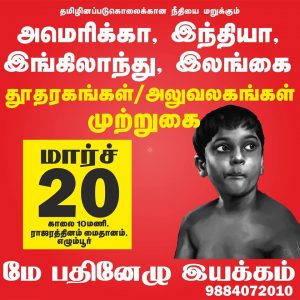 – Conduct Tamil Eelam Referendum & Independent International Investigation on Srilanka for Tamil Genocide since 1940 until today.