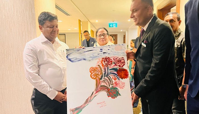 ஜனாதிபதி ரணில் விக்கிரமசிங்கவிற்கு முதலமைச்சர் மம்தா பானர்ஜி ஓவியம் ஒன்றையும் பரிசாக வழங்கினார்.