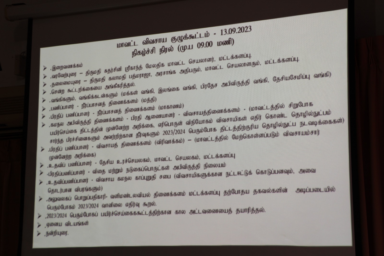 விவசாயிகளுக்கு அரச வங்கி கடன்கள் வழங்குதல், கடந்த சிறு போக நெற்பயிற்சிகையின் முன்னேற்ற அறிக்கை, பெரும்போகத் திட்டமிடல் தொழில்நுட்ப நடவடிக்கைகள், விதைநெல் உரம் வழங்குதல், விவசாயிகளின் வரட்சி நிவாரண காப்புறுதிகள், நட்டஈட்டுக் கொடுப்பனவு வழங்குதல், பொரும்போகத்தின் போது ஏற்படக்கூடிய வெள்ள அனர்த்தங்களை தடுத்தல், உள்ளிட்ட பல விடையதாங்கள் தொடர்பாக சம்பந்தப்பட்ட திணைக்கள தலைவர்களுடன் கலந்துரையாடி முடிவுகள் எட்டப்பட்டன.
