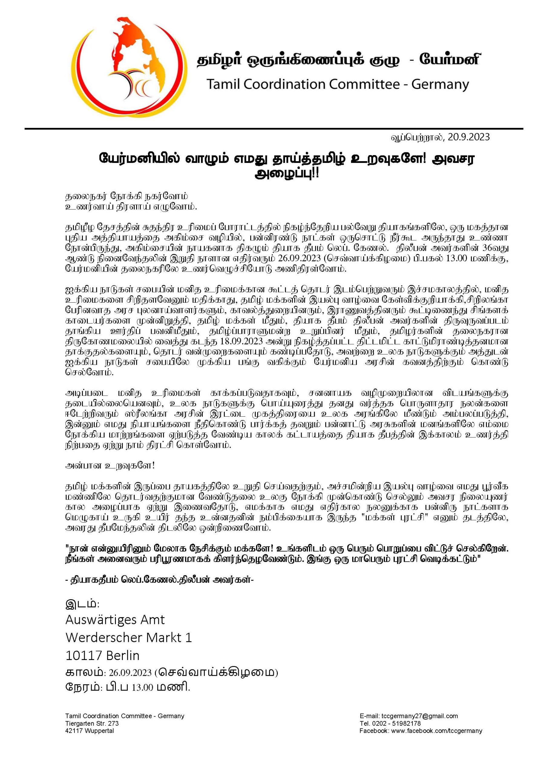 தமிழீழ தேசத்தின் சுதந்திர உரிமைப் போராட்டத்தில் நிகழ்ந்தேறிய பல்வேறு தியாகங்களிலே, ஒரு மகத்தான புதிய அத்தியாயத்தை அகிம்சை வழியில், பன்னிரண்டு நாட்கள் ஒருசொட்டு நீர்கூட அருந்தாது உண்ணா நோன்பிருந்து, அகிம்சையின் நாயகனாக திகழும் தியாக தீபம் லெப். கேணல். திலீபன் அவர்களின் 36வது ஆண்டு நினைவேந்தலின் இறுதி நாளான எதிர்வரும் 26.09.2023 (செவ்வாய்க்கிழமை) பி.பகல் 13.00 மணிக்கு, யேர்மனியின் தலைநகரிலே உணர்வெழுச்சியோடு அணிதிரள்வோம்.