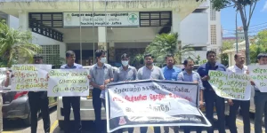 யாழ்.மாவட்டத்திலுள்ள ஆதார வைத்தியசாலைகள் மற்றும் யாழ்.போதனா வைத்தியசாலையில் பணியாற்றும் சுகாதாரப் பணியாளர்களால் இன்று போதனா வைத்தியசாக்கு முன்பாகக் கவனயீர்ப்புப் போராட்டமொன்று முன்னெடுக்கப்பட்டது.