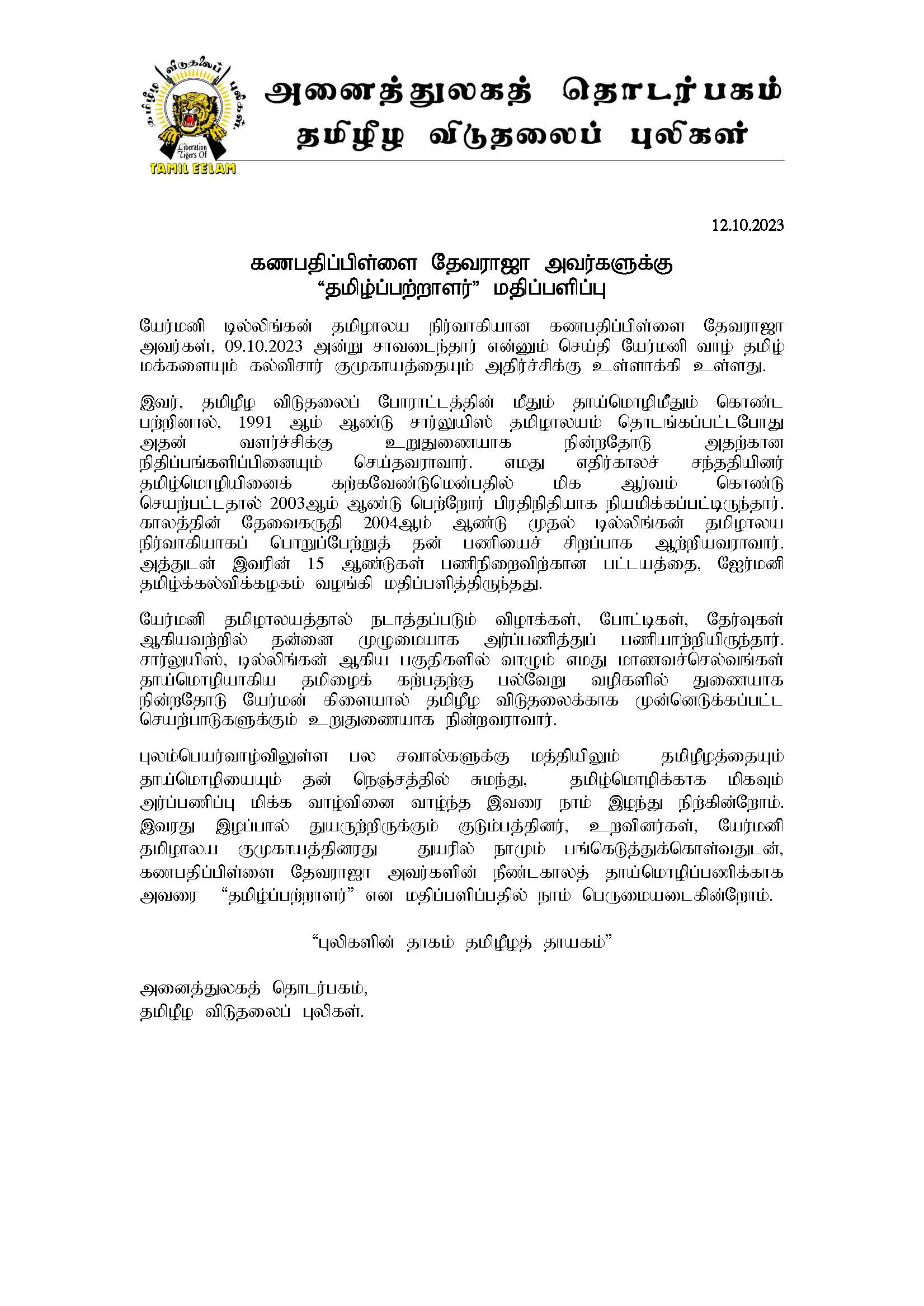 கணபதிப்பிள்ளை தேவராஜா அவர்களின் நீண்டகாலத் தாய்மொழிப்பணிக்காக அவரை “தமிழ்ப்பற்றாளர்” என மதிப்பளிப்பதில் நாம் பெருமையடைகின்றோம்.