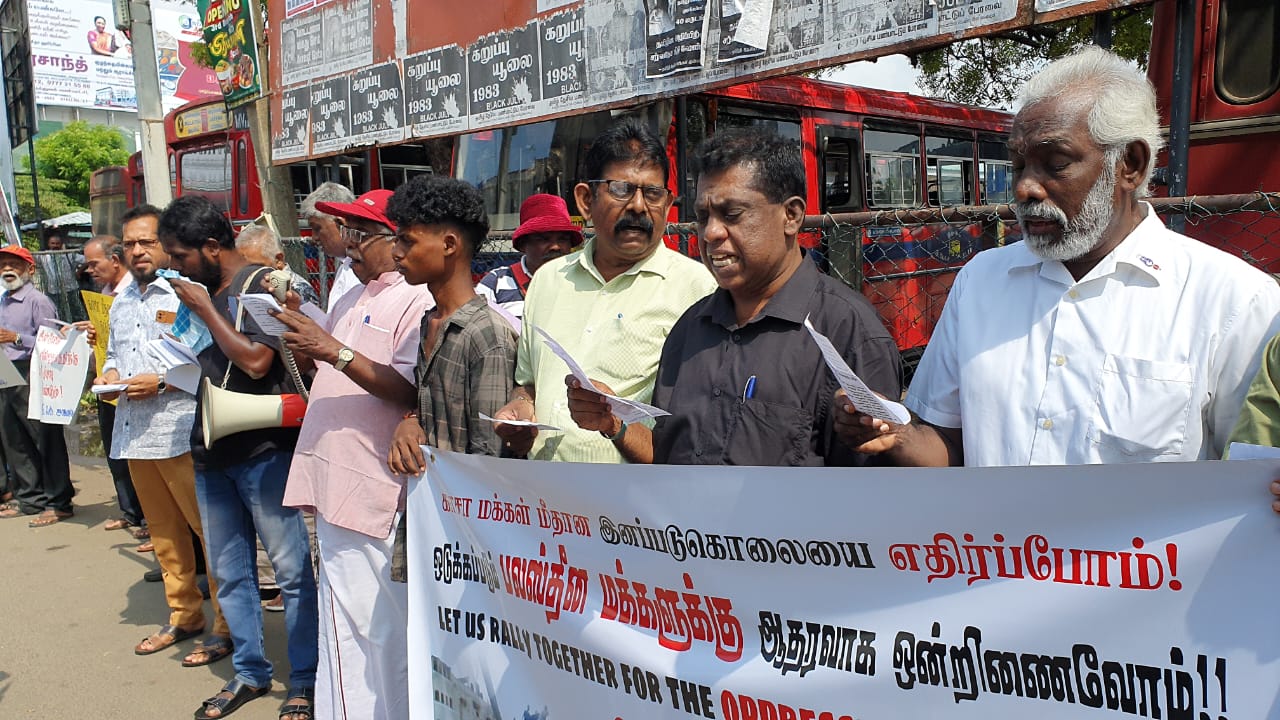 காசாவில் இஸ்ரேலியப் படைகள் மேற்கொண்டு வரும் யுத்த நெறிமுறைகளையும் மீறிய தாக்குதல்களினால் மிகப்பெரும் மனிதப்பேரழிவுக்கு ஆளாகியிருக்கும் பாலஸ்தீன மக்களுக்கு ஆதரவாக அவர்களுக்கு நீதி வேண்டியும், இஸ்ரேலைக் கண்டித்தும் இன்று சனிக்கிழமை (21) யாழ் மத்திய பேருந்து நிலையத்துக்கு முன்பாகக் கவனயீர்ப்புப் போராட்டம் இடம்பெற்றது.