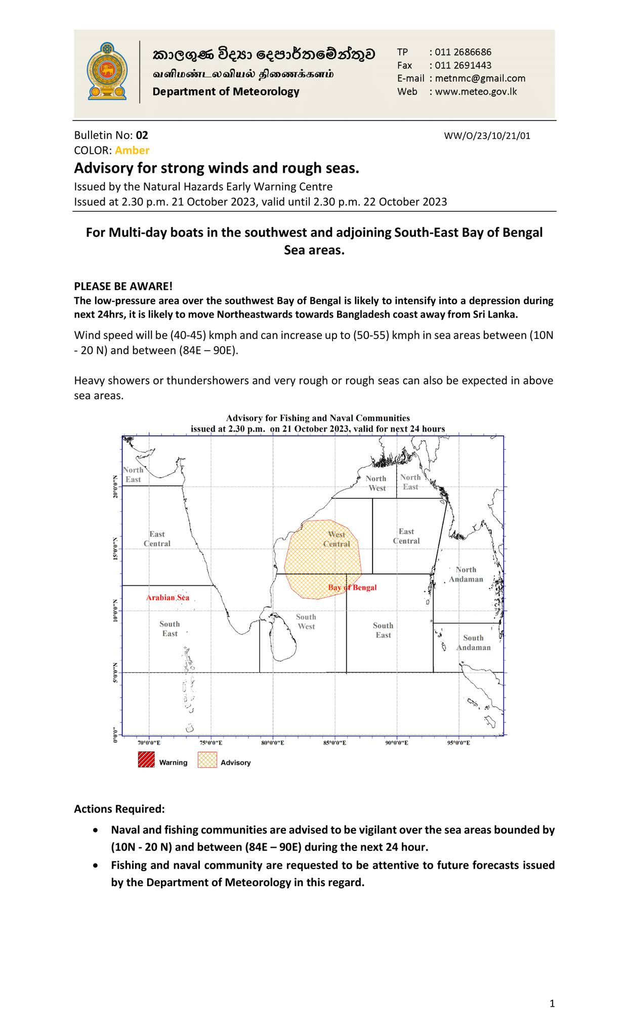 ஆகையினால் மீனவர்களும் கடல்சார் ஊழியர்களும் அடுத்துவரும் 24 மணித்தியாலங்களுக்கு குறிப்பிட்ட கடல் பிராந்தியங்களுக்கு செல்ல வேண்டாம் என அறிவுறுத்தப்படுகின்றனர்.