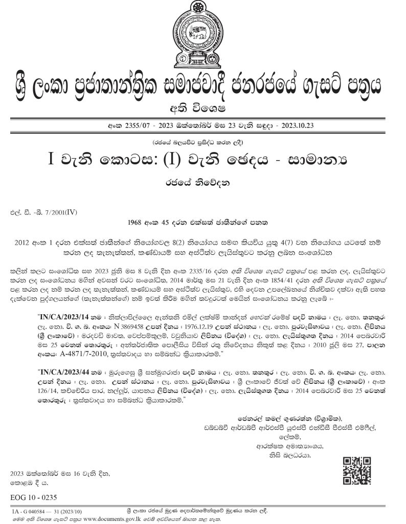 பாதுகாப்பு அமைச்சின் செயலாளர் ஜெனரல் கமல் குணரத்னவினால் இந்த வர்த்தமானி வெளியிடப்பட்டுள்ளது. அதற்கான வர்த்தமானி கீழே கொடுக்கப்பட்டுள்ளது.