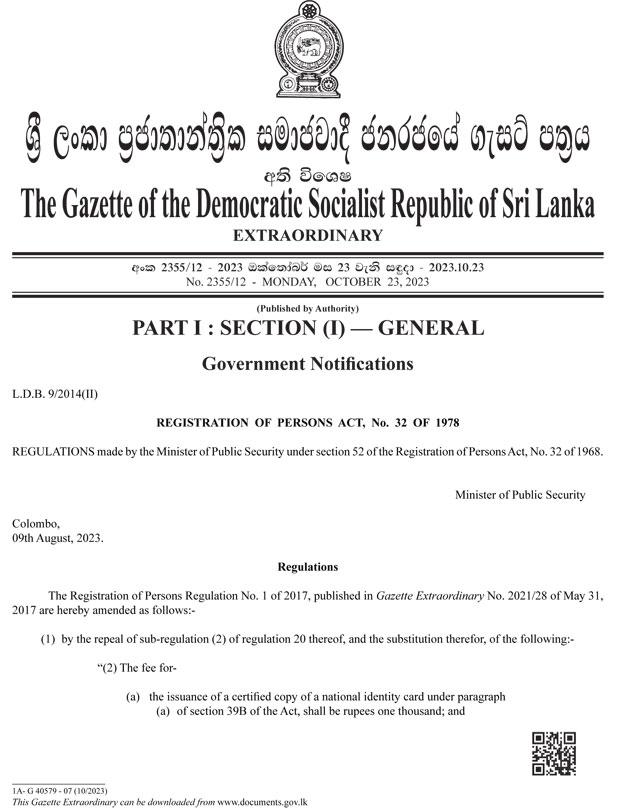 தேசிய அடையாள அட்டையின் சான்றளிக்கப்பட்ட பிரதிக்கான கட்டணம் 1,000 ரூபாவாக நிர்ணயிக்கப்பட்டுள்ளது.