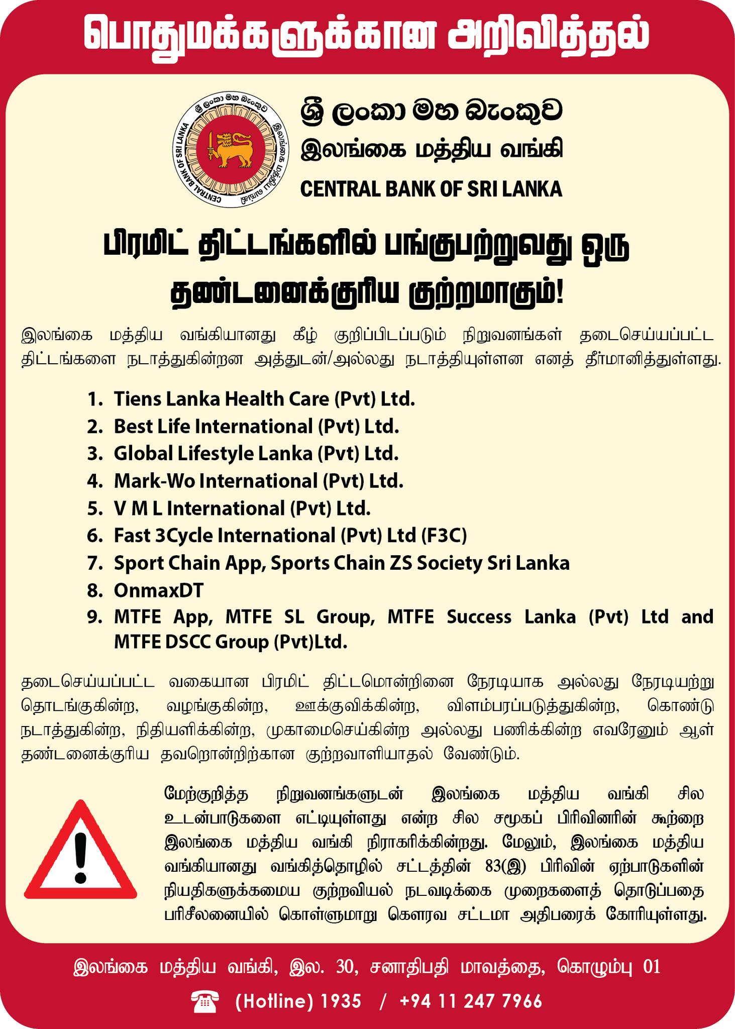 குறித்த நிறுவனம் இலங்கை மத்தியவங்கயினால் தடை செய்யப்பட்டுள்ளமை குறிப்பிடத்தக்கது.