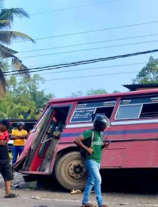 ஒரே திசையில் பயணித்த முச்சக்கரவண்டி ஒன்று திடீரென வலது பக்கம் நோக்கி திரும்ப முற்பட்டதில் பேருந்து வீதியை விட்டு விலகி சுவரில் மோதுண்டு விபத்திற்குள்ளாகியுள்ளது.