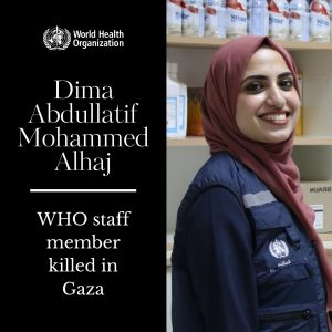 உலக சுகாதார பணியகம் காசாவில் இஸ்ரேலின் தாக்குதலில் தனது பெண் பணியாளர் டிமா அப்துல்இலத்தீவ் முகமட் அல்ஹாஜ்; கொல்லப்பட்டுள்ளார் என அறிவித்துள்ளது.