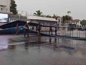 பலத்த காற்றுடனான கன மழை காரணமாக கொழும்பு பண்டாரநாயக்க ஞாபகார்த்த சர்வதேச மாநாட்டு மண்டபத்துக்கு (BMICH) முன்னால் உள்ள பெரிய விளம்பர பலகையொன்று சற்று முன்னர் உடைந்து வீதியில் விழுந்துள்ளது.