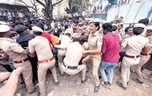 சுவர் ஏறி குதித்த தொண்டர்கள்: தேமுதிக கட்சித் தலைமை அலுவலகத்தையொட்டி உள்ள 2 மேம்பாலங்களின் மீது ஏறி நின்று பொது மக்கள் மற்றும் தொண்டர்கள் விஜயகாந்த் உடலுக்கு அஞ்சலி செலுத்தினர். தேமுதிக அலுவலகத்துக்குள் நுழைய கட்டுப்பாடுகள் விதிக்கப்பட்டதால், உள்ளே நுழைந்து அஞ்சலி செலுத்த வேண்டும் என்ற ஆர்வத்தில் சில தொண்டர்கள் சுவர் ஏறிக் குதித்து கட்சி அலுவலகத்துக்குள் நுழைய முயன்றனர். அவர்களை போலீஸார் தடுத்து நிறுத்தினர்.