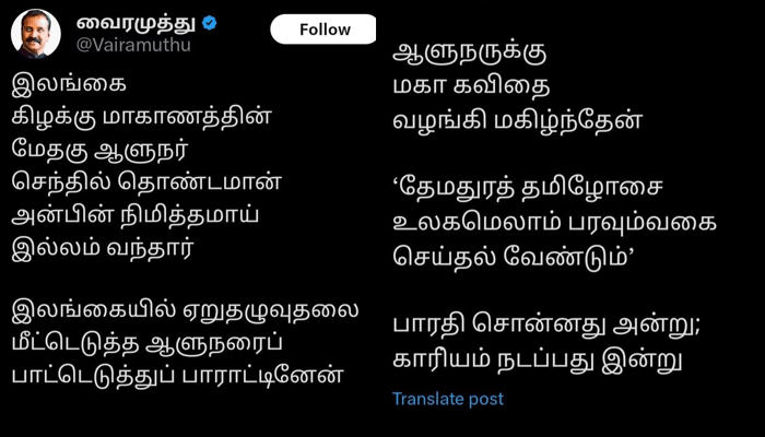 மேலும் கவிஞர் வைரமுத்து,தமிழ் பாரம்பரியத்தை மீட்டெடுத்த ஆளுநர் செந்தில் தொண்டமானை அகமகிழ்ந்து பாட்டெடுத்து வாழ்த்துவதாக தனது டுவிட்டர் பதிவில் தெரிவித்துள்ளார்.