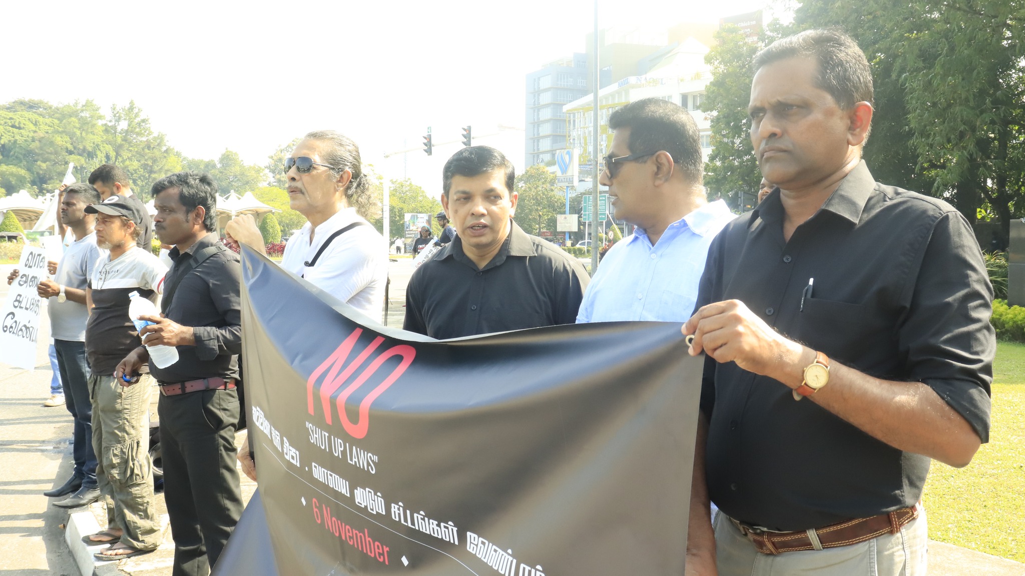 உத்தேச நிகழ்நிலை காப்புச் சட்டமூலத்தை 2 ஆம் வாசிப்பு மீதான விவாதத்துக்கு சபையில் எடுத்துக்கொள்ள வேண்டாமென எதிர்ப்புத் தெரிவித்தே குறித்த ஆர்ப்பாட்டம் முன்னெடுக்கப்பட்டுள்ளது.