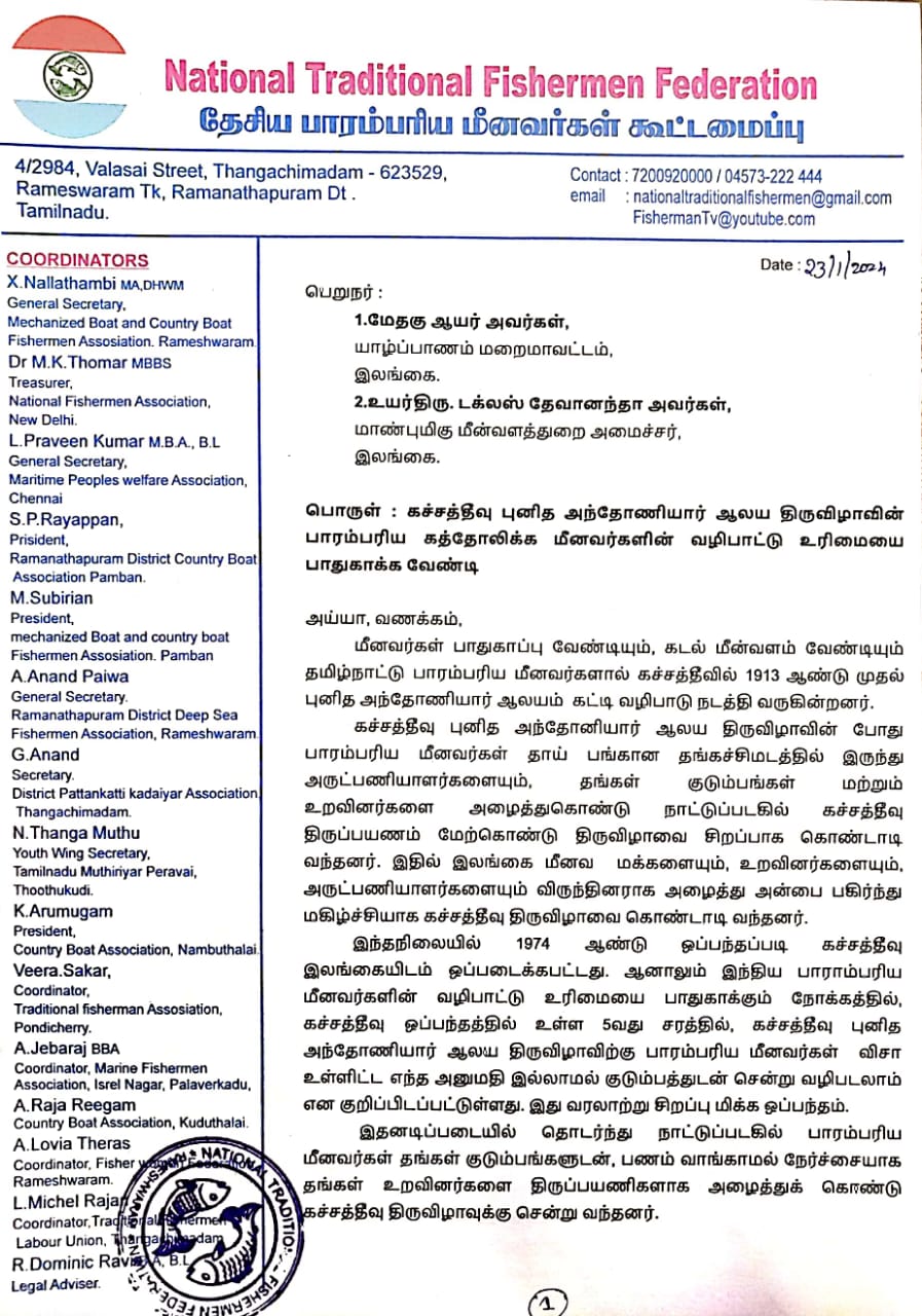 இந்தியா, தமிழ்நாடு – இராமநாதபுரம் கச்சத்தீவு பாரம்பரிய நாட்டுப்படகு திருப்பயண குழுவினால் கடற்றொழில் அமைச்சர் டக்ளஸ் தேவானந்தா மற்றும் யாழ் மறை மாவட்ட ஆயர் ஆகியோருக்கு அனுப்பி வைக்கப்பட்டுள்ள கடிதத்தில் இவ்வாறு கோரப்பட்டுள்ளது.