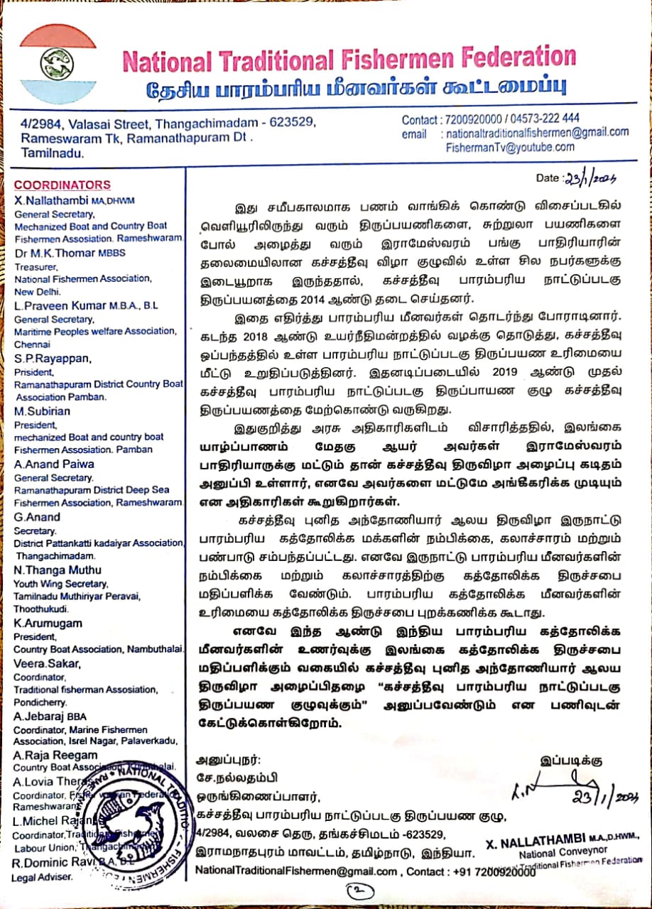 எனவே இந்த ஆண்டு இந்திய பாரம்பரிய கத்தோலிக்க மீனவர்களின் உணர்வுக்கு இலங்கை கத்தோலிக்க திருச்சபை மதிப்பளிக்கும் வகையில் கச்சத்தீவு புனித அந்தோணியார் ஆலய திருவிழா அழைப்பிதழை கச்சத்தீவு பாரம்பரிய திருப்பயண குழுவுக்கும் அனுப்பவேண்டும் என பணிவுடன் கேட்டுக்கொள்கிறோம்.