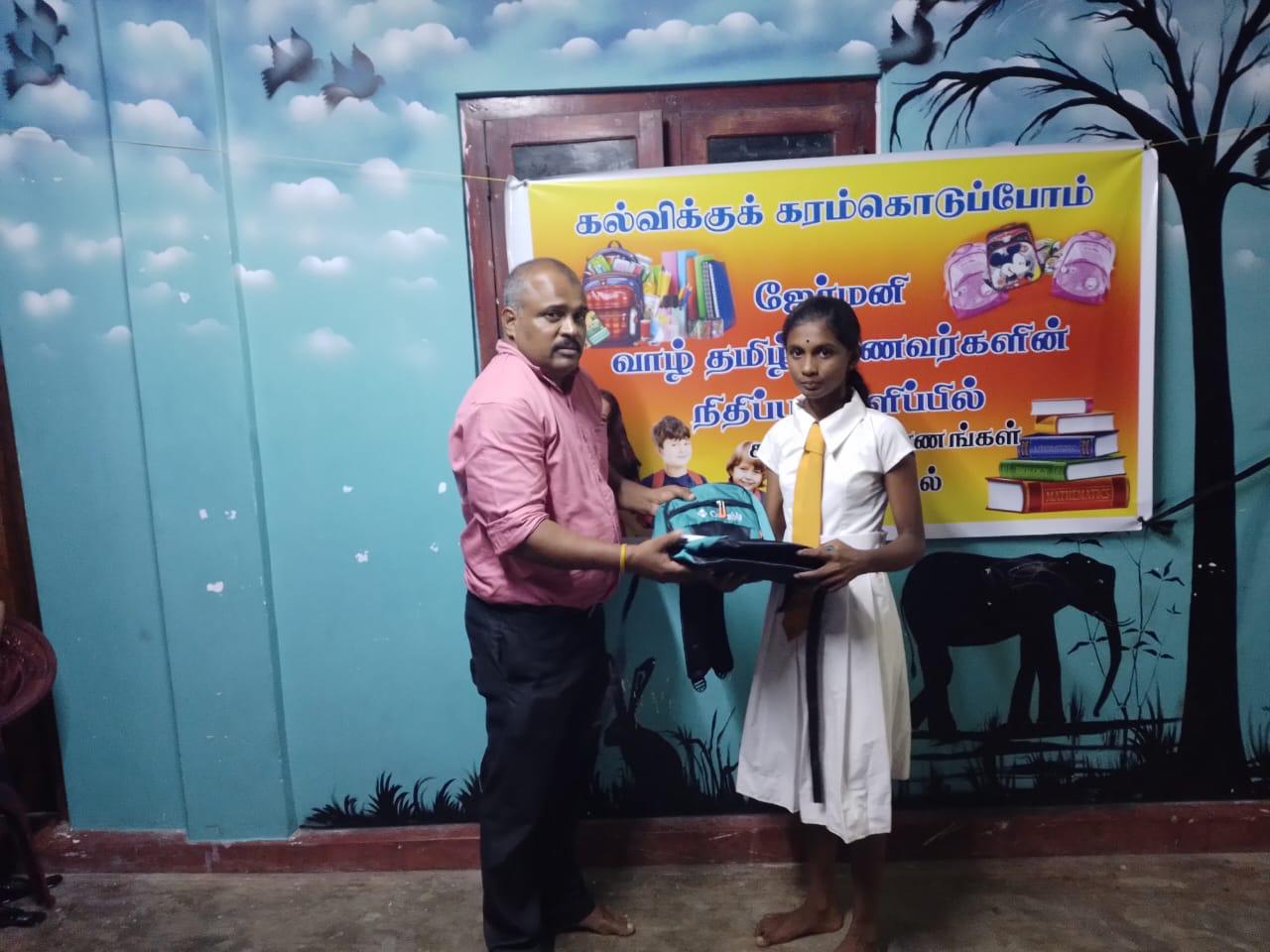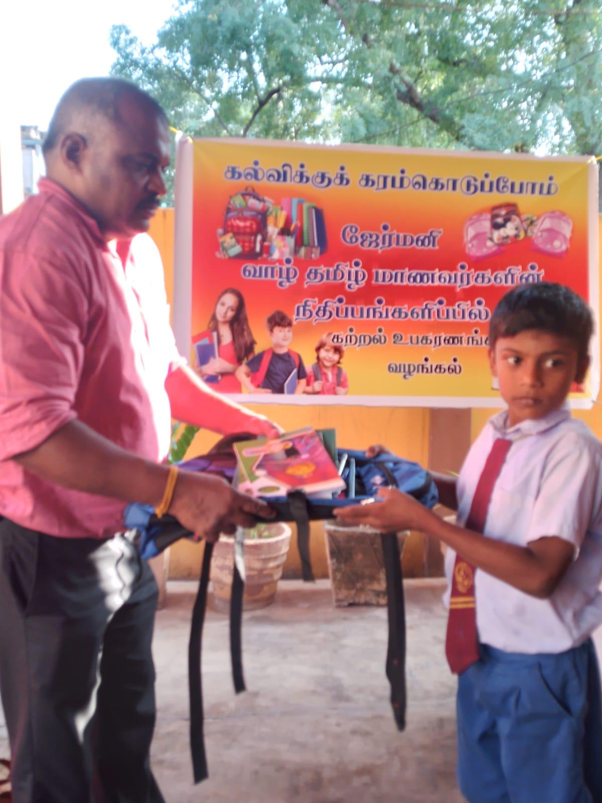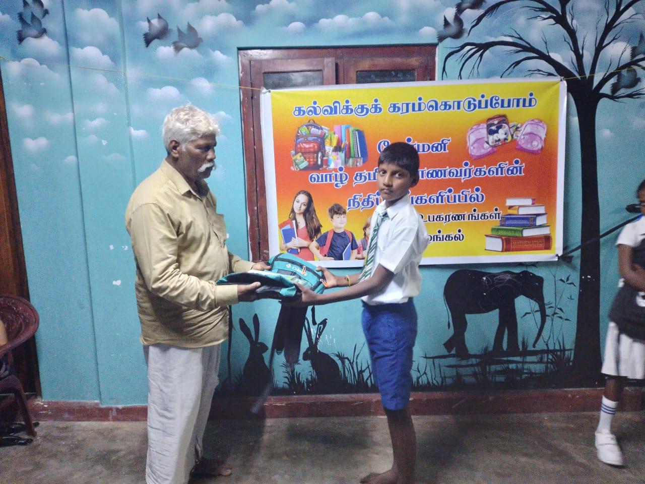 கல்விக்கு கரம்கொடுப்போம் செயற்திட்டத்தின்கீழ் யாழ் மாவட்டத்தில் 60 மாணவருக்கான கற்றல் உபகரணம் யேர்மன் வாழ் தமிழ் மாணவர்களின் நிதிப் பங்களிப்பில் கற்றல் உபகரணம் மற்றும் பொத்தக பை என்பன 27.02.2024 இன்று வழங்கி வைக்கப்பட்டது இதில் கரவெட்டி மற்றும் நெல்லியடி பகுதிகளைச்சேர்ந்த மாணவர்கள் கற்றல் உபகரணங்களைபெற்று பயன்பெற்றனர்.மேலும் யாழ் மாவட்டத்தில் 45 மாணவருக்கான கற்றல் உபகரணம் யேர்மன் வாழ் தமிழ் மாணவர்களின் நிதிப் பங்களிப்பில் கற்றல் உபகரணம் மற்றும் பொத்தக பை என்பன வழங்கி வைக்கப்பட்டது. வல்வெட்டித்துறை ஆதிகோவிலடி பகுதியை சேர்ந்த மாணவர்கள் கற்றல் உபகரணங்களைபெற்று பயன்பெற்றனர்.