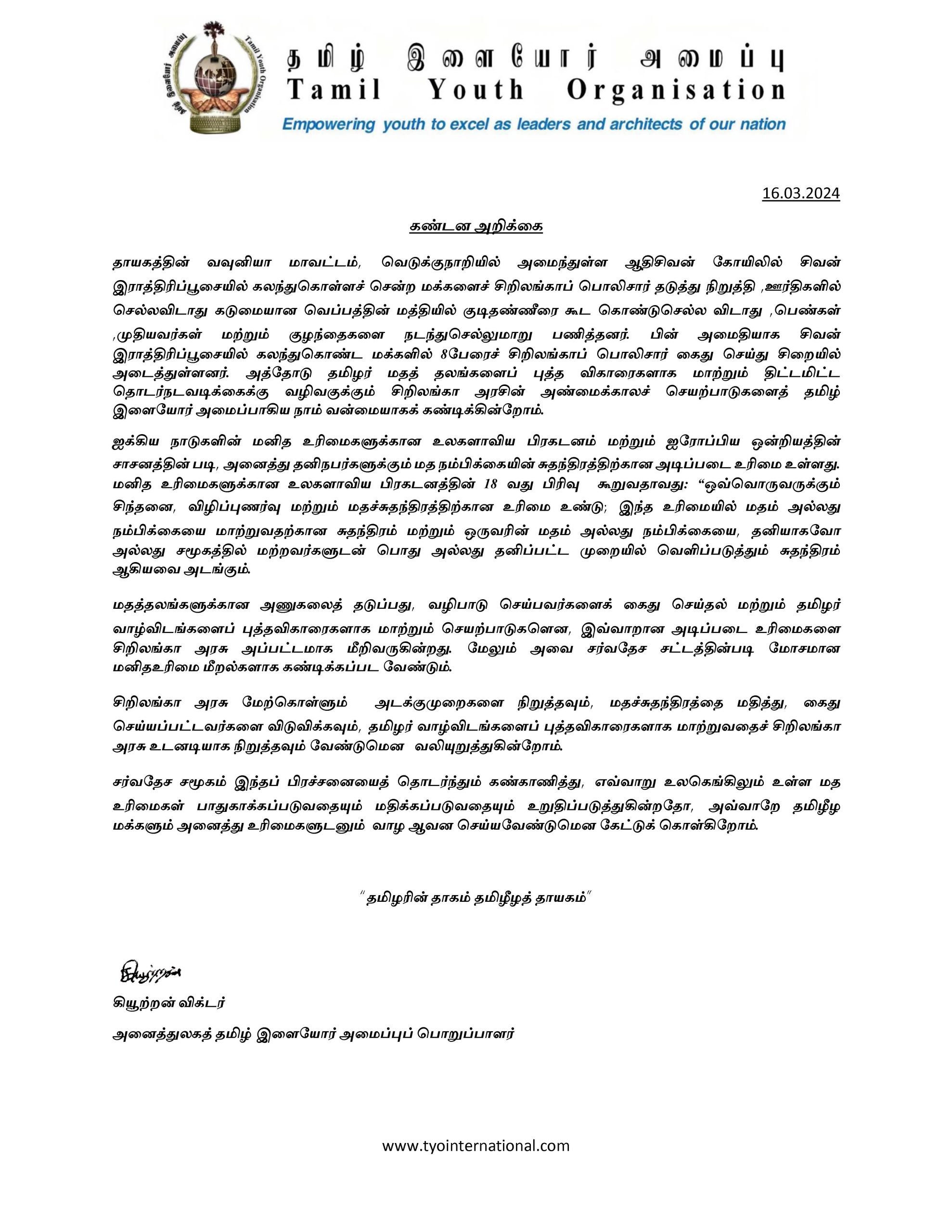 தாயகத்தின் வவுனியா மாவட்டம், வெடுக்குநாறியில் அமைந்துள்ள ஆதிசிவன் கோயிலில் சிவன் இராத்திரிப்பூசையில் கலந்துகொள்ளச் சென்ற மக்களைச் சிறிலங்காப் பொலிசார் தடுத்து நிறுத்தி ஊர்திகளில் செல்லவிடாது கடுமையான வெப்பத்தின் மத்தியில் குடிதண்ணீரை கூட கொண்டுசெல்ல விடாது பெண்கள் முதியவர்கள் மற்றும் குழந்தைகளை நடந்துசெல்லுமாறு பணித்தனர். பின் அமைதியாக சிவன் இராத்திரிப்பூசையில் கலந்துகொண்ட மக்களில் 8பேரைச் சிறிலங்காப் பொலிசார் கைது செய்து சிறையில் அடைத்துள்ளனர். அத்தோடு தமிழர் மதத் தலங்களைப் புத்த விகாரைகளாக மாற்றும் திட்டமிட்ட தொடர்நடவடிக்கைக்கு வழிவகுக்கும் சிறிலங்கா அரசின் அண்மைக்காலச் செயற்பாடுகளைத் தமிழ் இளையோர் அமைப்பாகிய நாம் வன்மையாகக் கண்டிக்கின்றோம்.