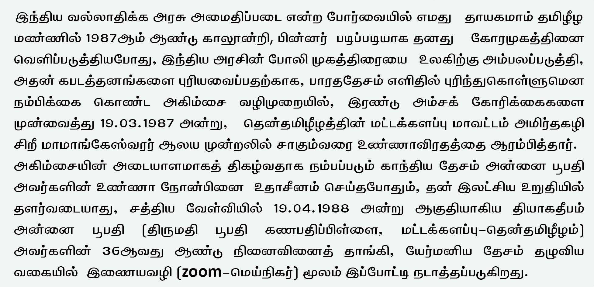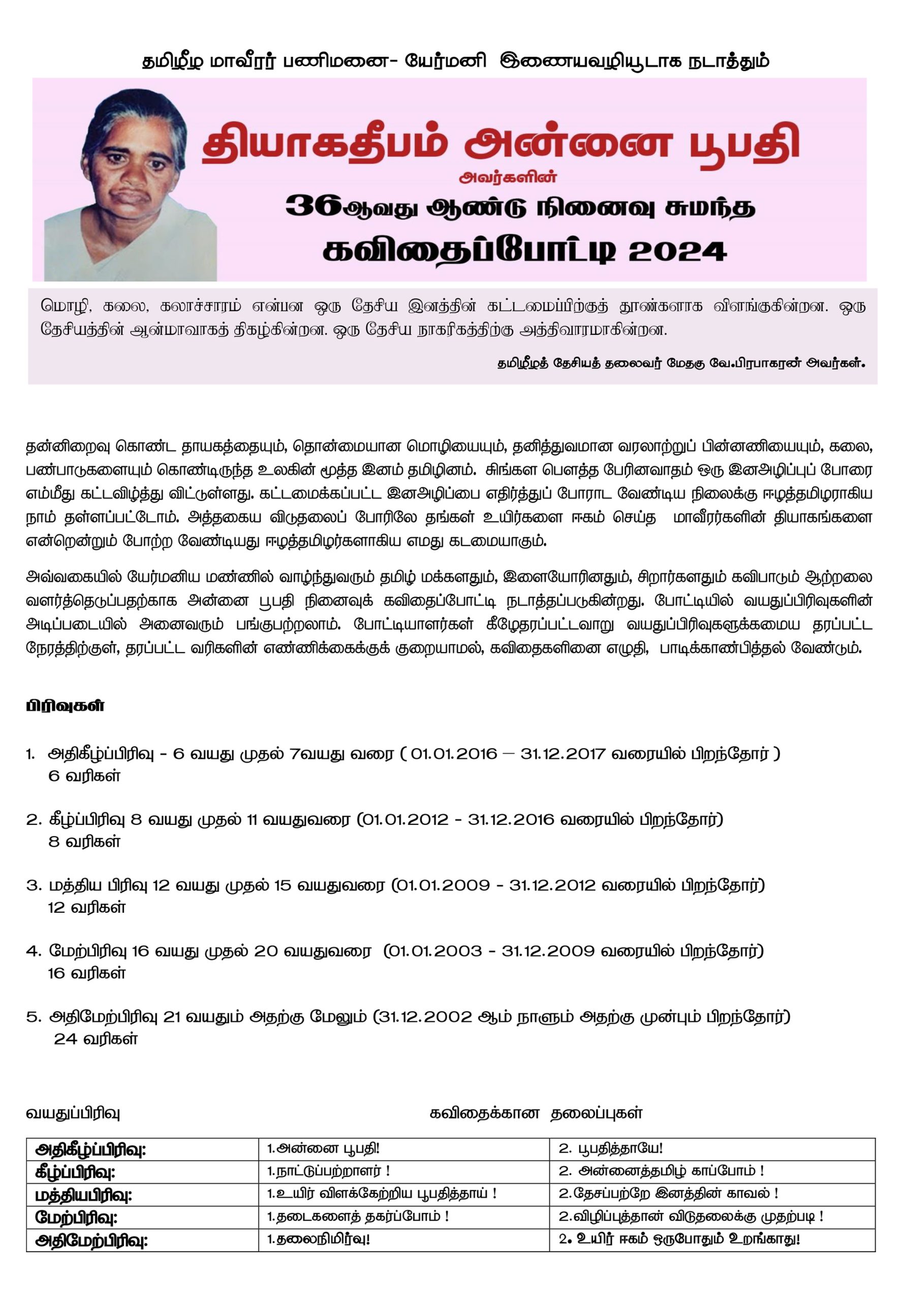 தியாக தீபம் அன்னை பூபதி அவர்களின் நினைவுக் கவிதைப் போட்டி- யேர்மனி 2024
