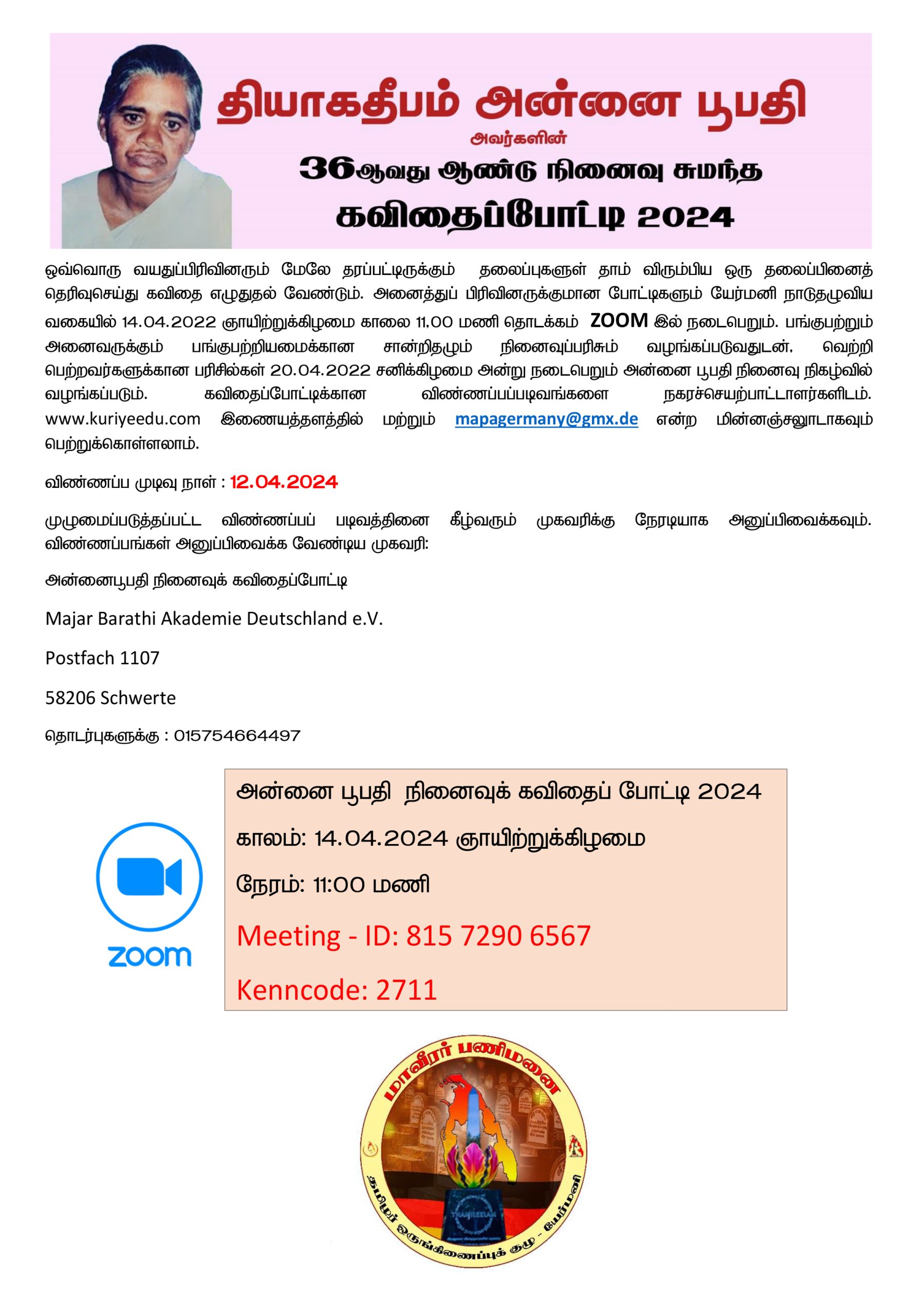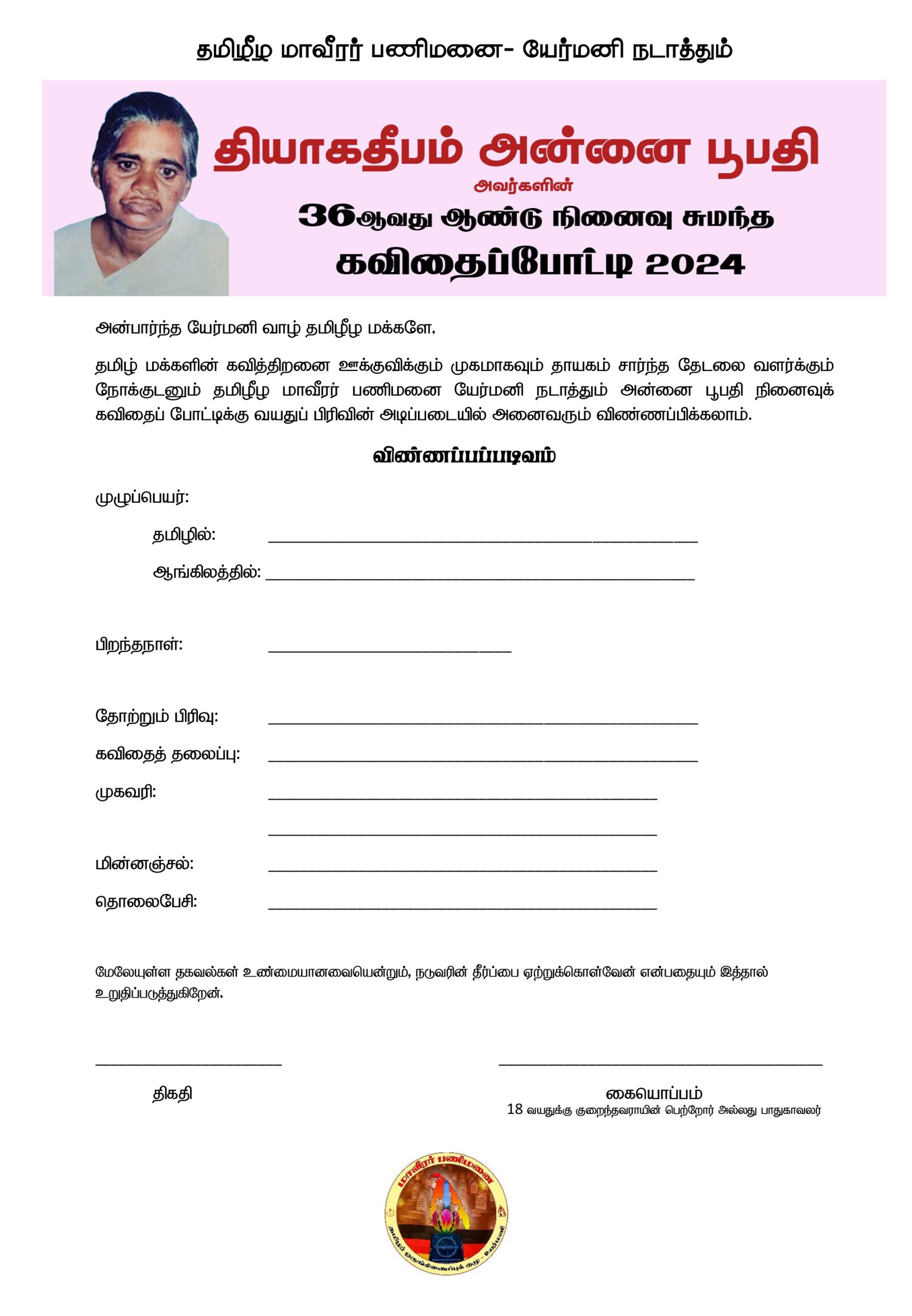 - தியாக தீபம் அன்னை பூபதி அவர்களின் நினைவுக் கவிதைப் போட்டி- யேர்மனி 2024