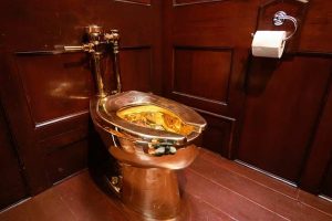 இந்த தங்க கழிப்பறை இருக்கை 2019 இல் கண்காட்சிக்காக வைக்கப்பட்ட போது பிளென்ஹெய்ம் அரண்மனையிலிருந்து திருடப்பட்டது. இந்த கழிப்பறை இருக்கை ஒரு அசாதாரண கலை படைப்பு. இது இத்தாலிய கலைஞரான மரியோ கேட்டலன் (Maurizio Cattelan)என்பவரால் வடிவமைக்கப்பட்டது.
