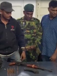 அங்கு வீட்டின் மேற்கூரையின் பின்பகுதியில் உள்ள பயணப்பையில் வைக்கப்பட்டிருந்த டி-56 ரக தானியங்கி துப்பாக்கி, 14 தோட்டாக்கள் கொண்ட மகசீன், வாள், கத்தி உள்ளிட்ட கூரிய ஆயுதங்களுடன் மூவர் கைது செய்யப்பட்டனர்.