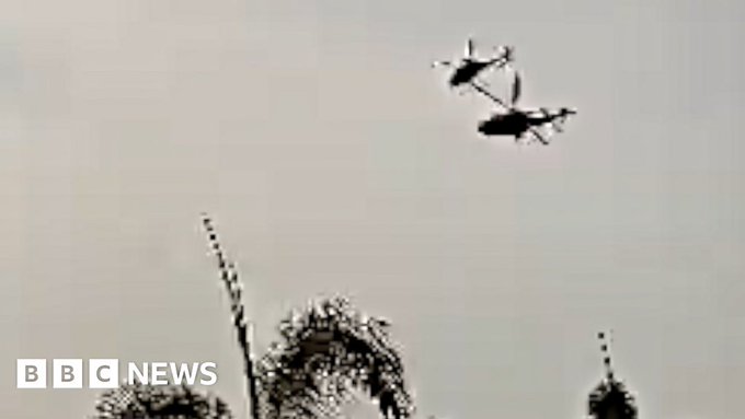 இந்த இரண்டு ஹெலிக்கொப்டர்களும் தரையில் விழுந்து நொருங்குவதற்கு முன் ஒன்றுடன் ஒன்று மோதிக் கொண்டதாக உள்ளூர் ஊடக நிகழ்ச்சிகளில் வெளியான காணொளியில் பதிவாகியுள்ளது.