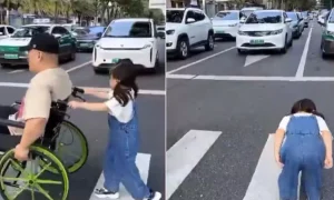 அந்த வீடியோவில், ஒரு சிறுமி பரபரப்பான சாலையில் சக்கர நாற்காலியில் ஒருவரை தள்ளிக் கொண்டு சாலையை கடக்கும் காட்சிகள் உள்ளது. அப்போது வாகனங்கள் அனைத்தும் சாலையையொட்டி நிற்கும் நிலையில் சக்கர நாற்காலியில் முதியோரை தள்ளிக் கொண்டு செல்லும் சிறுமி ஒவ்வொரு 3 அடிகளிலும் போக்குவரத்து சிக்னலில் வாகனங்களில் காத்து நிற்கும் கார் டிரைவர்கள் முன்பு பணிந்து நின்று அவர்களுக்கு நன்றி தெரிவிக்கும் காட்சிகள் உள்ளது.