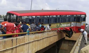 பஸ்சில் 20 பயணிகள் பயணித்துள்ளனர்.துமகுரு சாலையில் நெலமங்களா அருகே மதநாயக்கனஹள்ளி என்ற இடத்தில் உள்ள மேம்பாலத்தில் பஸ் சென்றுகொண்டிருந்த போது, திடீரென்று ஓட்டுநரின் கட்டுப்பாட்டை இழந்து சுவரில் முட்டி விபத்துக்குள்ளானது.