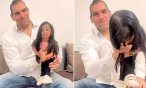 இந்தியாவை சேர்ந்த பிரபல மல்யுத்த வீரரான தி கிரேட் காளி, உலகிலேயே மிகவும் குட்டையான பெண் என பெயர் பெற்ற ஜோதி ஆம்கேவை சந்தித்து பேசிய காட்சிகள் இணையத்தில் பரவி வருகிறது.